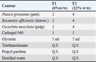 Medicinal plant extractsExtraction resulted in the following characteristic preparations of each botanical: pomegranate peel (80% methanol) produced a viscous, dark red extract, rosemary leaves (80% ethanol) yielded an olive green extract with a spicy scent, and pumpkin fibers (50% acetone) yielded a golden-brown extract with a slight woody scent and a soft, tacky texture. The two carbopol-based topical gels (GF-12% and GF-6%) remained blurred before application. The clear differentiation between the two formulations enabled dose-response interrogation for the rat infectious model (Fig. 5).