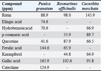 AbstractBackground: The rising need for adjunctive plant-based wound therapeutics with anti-inflammatory, antibacterial, and prohealing properties stems from the growing concern of antibiotic-resistant wound infections in companion animals. Aim: To determine the main bacterial agents in feline wound infections and to test a new polyherbal gel made from Punica granatum peel, Rosmarinus officinalis leaves, and Cucurbita moschata fibers on Staphylococcus aureus-infected rat wounds model. Methods: VITEK-2 was used to confirm the results of culturing and blood, MacConkey, and Mannitol salt agars from veterinary clinics, blood collection camps in Baghdad. The plant materials were Soxhlet-extracted, and polyphenols were analyzed by high-performance liquid chromatography. There were five groups of rats, which included the non-infected control, the infected untreated control, the infected and 6% gel, the infected and 12% gel, and the infected and 2% fucidin. Carbopol gel with 6% (GF6%) and 12% (GF12%) total extracts was macerated and administered once a day for 10 days to excisional wounds infected with S. aureus (1.5 × 108 CFU/ml). The outcome measures were the percentage of wound contraction, absolute values of hydroxyproline (Hyp), ELISA values of vascular endothelial growth factor (VEGF), tumor necrosis factor-α (TNF-α), and histopathological examination Results: Staphylococcus aureus was the most prominent isolate (52.8% overall prevalence, most in accidental and postsurgical wounds). The extracts were rich in polyphenols, and GF12% (among other extracts) was able to achieve complete wound closure by day 10 (100%), whereas fucidin 2% and infected controls were 34% and GF6% 97%, respectively. GF12% greatly lowered VEGF and TNF-a levels relative to controls and fucidin while markedly elevating Hyp, suggesting increased collagen deposition. Histology after treatment with GF12% demonstrated orderly reepithelialization and collagen deposition akin to normal skin, whereas immature granulation and persistent inflammation were observed in fucidin-treated wounds. Conclusion: The polyherbal gel, especially at 12% concentration, had the most healing effect on wounds infected with S. aureus due to its powerful antibacterial, anti-inflammatory, collagen-restoring, and anti-angiogenic properties, presenting significant potential for topical use in veterinary wound care. Keywords: Cucurbita moschata, Punica granatum, Rosmarinus officinalis, Staphylococcus aureus, Wound healing. IntroductionIn the age of Antimicrobial resistance, bacterial infections of wounds in companion animals remain a substantial clinical and public health issue. Surveillance in various areas indicates the emergence of new pathogens in skin and soft tissue infections along with increased levels of multidrug resistance, which complicates clinical management and recovery (Chinemerem Nwobodo et al., 2022; Wang et al., 2024). From the human–animal–environment interface, metagenomic investigations, along with other studies, have increasingly documented the existence of AMR gene reservoirs and avenues for horizontal gene transfer, which amplifies the existing need for non-traditional antibiotics (Napita et al., 2025).Small animals commonly present with diverse (trauma, surgery, and bites) wounds that generate a variety of conditions that favor the colonization and infection from opportunistic and commensal bacteria that become resistant over time (Kožár et al., 2018; Lenart-Boroń et al., 2024). Among the major bacterial isolates, Staphylococcus aureus has a unique persisting challenge through direct cytopathic action on dermal fibroblasts and strong biofilm production that shields bacteria from the host’s immune and antimicrobial systems. Yokota et al. (2021) demonstrated that S. aureus can inhibit collagen production, which subsequently slows the remodeling phase of healing by disabling fibroblast migration. Roy et al. (2020) described how biofilm infection impairs collagen and granulation tissue construction in vivo, sustaining inflammation in unhealed or refractory wounds. These pathogen-induced deficits elucidate the inadequate debridement and topical care that fail without the accompanying strategies to both recover matrix dynamics and suppress the bacterial burden (Yokota et al., 2021). In attempts to alleviate the resistance to neutralizing bacterial microbes while aiding tissue reparation, novel interest in plants with antibacterial, anti-inflammatory, and matrix-stimulating properties has increased. Chojnacka and Lewandowska (2020) described how extracts with high concentrations of polyphenols can modulate the redox tone and neovascular signaling of chronic wounds, whereas Cioanca et al. (2025) documented how synergistic metal–polyphenol complexes dermally deliver and improve the bioactivity of topical applications. Tanideh et al. (2014) and Chinko and Precious-Abraham (2024) detailed how, in preclinical wound models of different botanicals, including various blends of Glycyrrhiza glabra preparations, re-epithelialization and exudate loss, as well as overall histologic maturation, improved as compared to the control, suggesting that there is a multi-modal mechanism congruent with the current demands of wound care (Chojnacka and Lewandowska, 2020). In this context, Punica granatum is prized as a potential topical application of wound healing therapy, which is attributed to the high degree of collagen supporting the organization of tissue, mediators, and inflammation that prevent bioactive tannins and flavonoids from eliciting a response. Stefanou et al. (2021) and Hemmati et al. (2020) reported narratives and explained experiments in which preparations based on pomegranate enhanced the closure rates of skin wounds and their histological quality in experimental animals. This applies to all types of injuries, including full-thickness skin defects. They also reported improved (better) epidermis continuity and dermal matrix