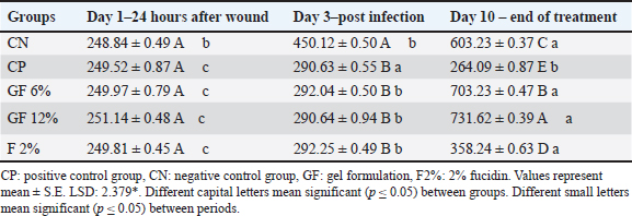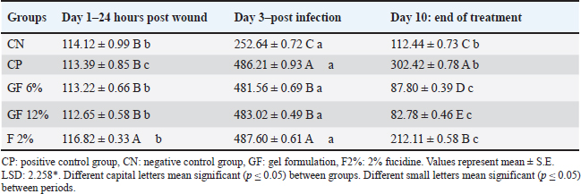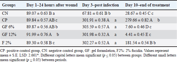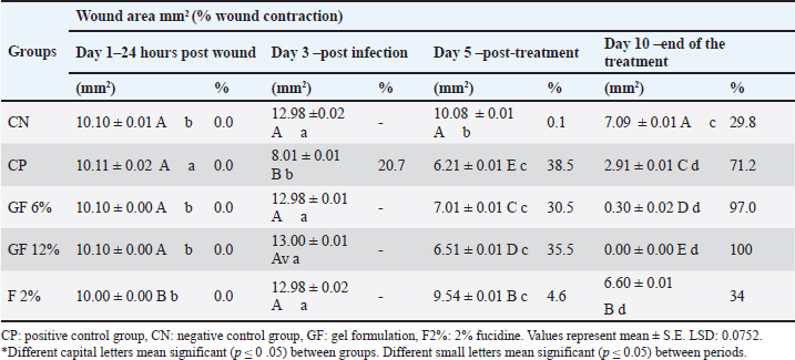Experimental designThe procedures in this study allowed achieving the objectives over the 10-day treatment period within 3 pre-defined phases, which are: 1, Assessment of the animal models post wounding (Table 2 and Fig. 1), 2, Assessment of the animals after infection, and 3, Assessment of the animals after treatment. All 10 animals in each of 5 groups were assigned to one of the 5 treatment groups; thus, 50 rats were used in the study. Group A: non-infected wound (negative control, CN); Group B: infected, non-treated wound (positive control, CP); Group C: infected wound treated topically with GF-6%; Group D: infected wound treated topically with GF-12%; Group E: infected wound treated topically with fucidin 2% (F-2%).