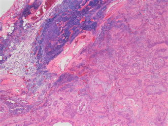 Fig. 3. Histopathological image of the biopsy from the cranial mediastinal mass showing neoplasia replacing normal thymic architecture. Necrotic areas not seen in this image. Histopathological report on the cranial mediastinal mass established the diagnosis of squamous cell carcinoma. The neoplasm extensively replaced normal architecture (Fig. 3) and was associated with broad zones of necrosis. The squamous cells had pleomorphic features, including variation in cell and nuclear size and shape, as well as elevated mitotic activity. The mediastinal lymph node had reactive lymphoid elements without evidence of metastatic neoplasia. Two days after discharge, the cat re-presented to the emergency department due to disinterest in food and dyspnea. Point of care ultrasound (POCUS) revealed a large volume of pleural effusion bilaterally, as well as scant pericardial effusion. Thoracocentesis of the left hemithorax yielded 250 ml of milky effusion. The effusate was assumed to be chylous in nature due to the gross appearance, additional testing of the fluid was declined due to financial constraints. After thoracocentesis, the cat’s respiratory rate and respiratory effort improved dramatically and no oxygen supplementation was required. The cat began eating voluntarily with a good appetite. Repeat POCUS was performed the next day, revealing a minimal volume of pleural effusion and unchanged volume of the pericardial effusion. Echocardiographic examination was indicative of restrictive filling in the diastolic phase, suggestive of pericarditis. The cat was discharged later that day. Two weeks postoperatively, the cat presented to the oncology department for commencement of chemotherapy. The client reported normal energy levels, consistently good appetite, and no evidence of respiratory compromise. Clinically relevant findings on complete blood count included an anemia without reticulocytosis of PCV 24% (RI 26%–46%) and reticulocyte count 4.8 K/ul (RI 2.0–50.0 K/ul), with normal white blood cell count (WBC) 4.81 × 109/l (RI 2.87–17.02 × 109/l), and normal neutrophil count 3.36 × 109/l (RI 2.30–10.29 × 109/l). Partial serum biochemistry abnormalities included decreased creatinine 39 umol/l (RI 71–212 umol/l), decreased blood urea nitrogen 5.4 mmol/l (RI 5.7–12.9 mmol/l), and decreased alanine aminotransferase <10 U/l (RI 12–130 U/l). Under sedation, POCUS revealed mild pleural effusion bilaterally and subsequent thoracocentesis yielded 60 ml of serous effusion. Intracavitary chemotherapy was administered with carboplatin 62 mg. Approximately 2 weeks after initiation of chemotherapy, the cat represented to the SASH emergency department for dyspnea. POCUS revealed a moderate volume of pleural fluid in both hemithoraxes, no pericardial effusion, and mass-like lesions in the cranial and caudal portion of the thorax. This was suspected to be pleural effusion due to carcinomatosis. Due to the cat’s clinical deterioration and unknown future prognosis, the owners elected for humane euthanasia. Full necropsy and further sampling and testing of the new lesions in the chest were not performed. DiscussionThe incidence of TETs in humans is rare with a reported rate of 2.2/1,000,000 for thymomas, and only 0.3/1,000,000 for thymic carcinomas, both associated with paraneoplastic syndromes including myasthenia gravis and other immune-mediated syndromes in up to 45% of cases (de Jong et al., 2008; Venuta et al., 2010). Myasthenia gravis and megaesophagus have been reported in up to 40% of dogs with thymoma as well as in cats, but was not seen in this case (Zitz et al., 2008; Robat et al., 2013). TETs are staged according to the Masaoka–Koga staging system, where local invasiveness is taken into consideration and the invasiveness correlates well with overall survival (Detterbeck et al., 2012; Girard et al., 2015). Recurrence rates are high in humans, ranging from 25% to 76% depending on the stage (Girard et al., 2015). In dogs, recurrence rates have been reported to be around 25%–40% (Martano et al., 2021; Yale et al., 2022). Due to the presence of macroscopic invasion into cranial vena cava on CT imaging and evidence of tumor infiltration into vascular connective tissue on histopathology, this cat would be stage III based on the Masaoka–Koga staging system (Detterbeck et al., 2012). A multi-institutional study showed that the median overall survival for human patients with thymic carcinoma was 6.6 years, with a recurrence rate of 35% at 5 years (Ahmad et al., 2015). In dogs with thymic carcinoma, the median survival time was 69 days (Burgess et al., 2015). In a reported case of a dog with metastatic thymic carcinoma, the dog was started on toceranib phosphate at initial diagnosis, with stable disease at restaging 6 months later; however, it died at 12 months postdiagnosis and treatment where local disease progression was noted (O’Connell et al., 2018). Postoperative chemotherapy as well as radiotherapy is recommended in cases of incompletely resected thymic carcinomas in humans (Girard et al., 2015). The use of tyrosine kinase inhibitors has been described in the human literature (Pagano et al., 2014; Remon et al., 2016), and in a single canine case (O’Connell et al., 2018). The first-line treatment for humans for nonresectable or recurrent disease is multiagent combinations containing platinum-based therapies such as cisplatin, doxorubicin and cyclophosphamide, or carboplatin and paclitaxel (Girard et al., 2015; Marx et al., 2015). Response rates to chemotherapeutic regimens including platinum derivatives were noted to be above 50% in the human literature (Berghmans et al., 2018); however, these regimens in addition to surgical excision as a treatment option for thymic carcinomas have not been evaluated in the veterinary literature. To our knowledge, this is the first reported case of a feline thymic carcinoma subtype squamous cell carcinoma treated initially with surgical management fo
