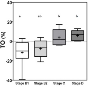 Fig. 1. Box plot graphic for TO of dogs with different stages of MMVD displaying the mean, SD and amplitude values. Stage B1 mean was statistically different from stages C and D means. Stage B2 mean was similar to stages B1, C, and D means. The mean ± SD for stages B1, B2, C, and D for TO were, respectively, −11 ± 12.5a, −7.5 ± 9.0ab, 4.2 ± 8.2b, 6.0 ± 5.5b. Different letters indicate statistically significant differences between groups ( p=0.005). TO, Turbulence onset; SD, Standard deviation. Same letters indicate similarity between groups. For TS the mean ± SD for groups B1, B2, C and D, in ms/RR, were respectively 46.8 ± 23.2a, 37.5 ± 15ab, 18.3 ± 13.5b, 16.5 ± 7.5b, p=0.0029, with different letters indicating statistically significant differences between groups (p ≤ 0.005). For both indicators stage B1 had the widest dispersion overall stages while stage D had the smallest dispersion.
