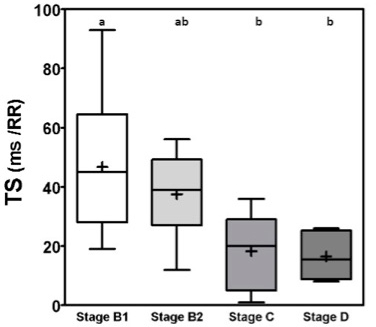 Fig. 2. Box plot graphic for TS of dogs with different stages of MMVD displaying the mean, SD and amplitude values. Stage B1 mean was statistically different from stages C and D means. Stage B2 mean was similar to stages B1, C, and D means. The mean ± SD for stages B1, B2, C, and D for TS were, respectively, 46.8 ± 23.2a, 37.5 ± 15ab, 18.3 ± 13.5b, 16.5 ± 7.5b, p=0.0029. TS, Turbulence slope; SD, Standard deviation. Same letters indicate similarity between groups. The ROC curves are plotted together in Figures 3 and 4, where we can compare the area under the curve (AUC) of TO and TS for different testing. In Figure 3, we can evaluate ROC curves for differentiating stages B1 and B2 from stages C and D, or asymptomatic dogs versus symptomatic dogs. In this interrogation, TO had an AUC (mean ± SD, 95% CI) of 0.883 ± 0.060, 0.764:1.00, while TS had an AUC (mean ± SD, 95% CI) of 0.890 ± 0.055, 0.782:0.999.