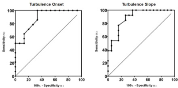Fig. 3. ROC curves of HRT for differentiating between stages B1 + B2 and C + D, asymptomatic dogs versus symptomatic dogs. In this interrogation, TO had an AUC (mean ± SD, 95% CI) of 0.883 ± 0.060, 0.764:1.00, while TS had an AUC (mean ± SD, 95% CI) of 0.890 ± 0.055, 0.782:0.999. In Figure 4, we can evaluate ROC curves for differentiating stage B1 from stages B2, C, and D, or dogs with non-remodeled hearts versus dogs with remodeled hearts. For this purpose, TO had an AUC (mean ± SD, 95% CI) of 0.800 ± 0.087, 0.628:0.971, while TS had an AUC (mean ± SD, 95% CI) of 0.795 ± 0.079, 0.640:0.950. When compared with the echocardiography exam, the values of TO and TS also showed moderate-to-weak correlation with commonly used parameters (statistical significance was set at p ≤ 0.05). The results are shown in Table 2. The results of Pearson analyses are plotted in Table 2, there was a weak correlation of TO and LA/Ao, the maximal transmitral E wave velocity and the E/E´ ratio. The TS showed a weak negative correlation with the E/A ratio, E/E´ ratio, while moderate negative correlation was found with E/isovolumetric relaxation time (IVRT), maximal E wave velocity and the left atrium/aorta ratio. Weak positive correlations were found between TS and the IVRT, with p < 0.05. DiscussionThe main hemodynamic effect of MMVD is the regurgitant orifice that leads to a regurgitant volume and reduced cardiac output (Öztürk et al., 2016). The overload consequences come as atrial and/or ventricle enlargement by eccentric hypertrophy and in some patients have diastolic or systolic dysfunction (Rasmussen et al., 2012; Bruce et al., 2019). The autonomic system compensatory responses to HF are the reduction of parasympathetic portion response and increase in sympathetic activity associated with high serum norepinephrine (NE) concentrations (Öztürk et al., 2016). The effects of sympathetic stimulus on the circulatory system are the increase in heart rate, contractility, and cardiac relaxation, while on the blood vessels the venous capacitance reduces and in peripheral resistance increases (Lymperopoulos et al., 2013). One test used in human medicine to assess the levels of autonomic response is the HRT (Schmidt et al., 1999). In this study, we tried to assess the autonomic response of small dogs diagnosed with MMVD through HRT indicators, TO and TS, using a holter monitor and electrocardiographic records. Our results show that TO had a variation within the groups, as early stages had mean value at the negative field and with broader amplitude, different than symptomatic stages. Stage B1 mean value was statistically different from stages C and D means, it had the widest dispersion overall and seems to have a negative skew. Stage B2 showed similarity to the other stages. Stage D also had the smallest dispersion among the groups. These findings suggest that the initial acceleration phase of the turbulence, TO, is present in a large portion of early patients, mainly in stage B1, and that the autonomic response diminishes as CHF appears in chronic stages of MMVD. Table 2. Correlation between heart rate turbulence of dogs with MMVD and echocardiographic parameters.