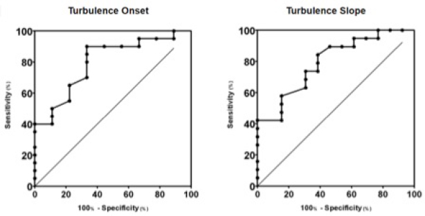 Fig. 4. ROC curves of HRT for differentiating between stages B1 and B2 + C + D, or dogs with non-remodeled hearts versus dogs with remodeled hearts. For this purpose, TO had an AUC (mean ± SD, 95% CI) of 0.800 ± 0.087, 0.628:0.971, while TS had an AUC (mean ± SD, 95% CI) of 0.795 ± 0.079, 0.640:0.950. In the HRT early phase, the heart rate acceleration is associated with parasympathetic withdrawal in response to less vagal stimulus due to VPC ineffective blood ejection (Wichterle et al., 2002). The correlation between TO and baroreflex sensitivity was lost only after combined autonomic blockade with atropine, suggesting that, not only parasympathetic activity but also the sympathetic nervous system might influence modulation of TO (Lin et al., 2002; Marine et al., 2002). The HR acceleration seems to be linked to the vagal activity directly over the sinus node (Marine et al., 2002), and it can be linked to the spontaneous baroreflex sensitivity (Lin et al., 2002). There are evidence that beta-blocker do not reduce TO value (Marine et al., 2002). The results of TS in this study shows that the mean ± SD in stage B1 is different than in stages C and D, as well as the amplitude of TS which was greater in stage B1 than in stages C and D. The TS of stage B2 was not different to B1, C, and D. These findings suggest that the baroreflex response is present in the early stages of the disease as seen in B1 group, and shows that this response significantly decreases in latter stages of the disease, represented by stages C and D, as HF worsens due to MMVD and compensatory response is necessary. The bigger the TS the greater is heart rate deceleration, this reflects the intensity of autonomic response. In higid humans, the late phase of HRT, so called TS, is known for decrease of heart rate and return of the frequency to levels previous to the VPC (Wichterle et al., 2002). The baroreflex sensitivity is responsible for this autonomic response that has both sympathetic and parasympathetic components involved (Bauer et al., 2008). There is evidence that in humans’ intravenous atropine results in reduction of TS. Humans under B-blockers also showed reduction of both parameters. TS was abnormal in all patients after receiving atropine (Marine et al., 2002). The correlation between TS and baroreflex sensitivity was lost after selective parasympathetic and combined autonomic blockade, with atropine and atropine + esmolol. Esmolol did not influence the TS. It was seen that the maintenance of normal HRT was vagally dependent; and that both TS and TO components of HRT were closely correlated with spontaneous baroreflex sensitivity (Lin et al., 2002). The values of TO and TS in the B1 group were considered statistically different from groups C and D, while group B2 had similar values to group B1 and groups C and D, making group B2 impossible to differentiate from the others. Results from groups C and D were also statistically similar. In group B1, the TO response had a large dispersion from negative to positive, but the mean value was negative, as seen in the B2 group. In groups C and D the means were above the zero line. Of note is that the amplitude for both TO and TS tended to be smaller as disease progressed. Our results suggest that the mean TO and TS values tend to be higher as the patient’s cardiac condition worsens. The results in this study shows that as the MMVD progresses the dog becomes symptomatic and supports that the vagal response is impaired in dogs with chronic HF due to MMVD. In one study showing a time-domain analysis after 1 minute of ocular compression in dogs with MMVD, revealed that for every index, the symptomatic group presented significantly lower values than control and the non-remodeled groups. After ocular compression, non-remodeled dogs significantly increased SDNN (SD of R-R intervals), root mean square of SD of R-R intervals (RMSSD) and Vasovagal Tonus Index (VVTI), whereas healthy controls demonstrated an increase in VVTI only (Brüler et al., 2018). This comes in accordance with the present study suggesting that dogs with heart disease but no-remodeled heart have some degree of parasympathetic response present. The diminished response in symptomatic dogs shows that the parasympathetic response in patients with remodeled hearts is impaired as it happens in humans with CHF (Eckberg et al., 1971). Also humans with untreated mitral regurgitation (MR) also present worse baroreflex when compared to treated patients (Öztürk et al., 2016). This supports our findings that dogs with heart disease in CHF stage, represented by stages C and D, have diminished autonomic response than dogs in non-congestive stages. In our study, there was no statistical difference between stage B2 and other stages for both TO and TS indicators. This agrees with another study showing that asymptomatic dogs with remodeled hearts have lower SDNN, RMSSD, and VVTI when compared to dogs with non-remodeled hearts. After ocular compression, there was no significant variation in these parameters in remodeled groups (Brüler et al., 2018). This supports the theory that autonomic imbalance precedes clinical evidence of heart disease (TFESCNASPE (Task Force of the European Society of Cardiology and the North American Society of Pacing and Electrophysiology), 1996). In dogs with dilated cardiomyopathy, significantly different results for TO and TS were found when comparing them to normal dogs, additionally dogs that survived more than 30 days after diagnosis had TO and TS different from dogs that did not survive (Noszczyk-Nowak, 2012a). Similar results were found in Doberman pinschers, where the normal dogs had the TO mean value significantly more negative than dogs with dilated cardiomyopathy (DCM) and DCM + CHF dogs. The TS for DCM and DCM + CHF dogs was significantly different than normal dogs (Harris et al., 2017). Furthermore, in the present study plus two other studies investigating HRT in dogs, the result
