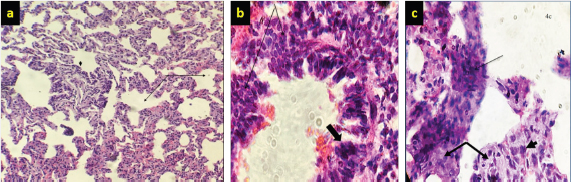 Fig. 4. (a) There is marked branching of the alveolar spaces (arrow) due to hyperplasia of alveolar cells and emphysema (thick arrow) (10×; H&E). (b) Higher magnification marked papillary projection toward the lumen of bronchioles (thick arrow) (40×; H&E). (c) Hypermagnification of marked hyperplasia epithelial cells (thick arrow) of bronchioles within infiltration of macrophages (arrow) in the mucosa of bronchioles (40×; H&E). Histopathological findings of lungs were mostly glandular transformation. Hyperplasia of alveolar cells causes branching of the alveolar spaces, as well as macrophage infiltration in the lung’s interstitial tissue and emphysema, was marked in some microsections with thickening of the interalveolar septa, alveolar exudative inflammation, and fibrosis with calcification (dystrophic calcification) (Fig. 6a and b). A necrosis-associated lymphocyte infiltration, resulting in marked hyperplasia of epithelial cells, especially lining of bronchioles, and desquamation of cells within the lumen of bronchioles is a consequence of this study. Furthermore, mediastinal lymph nodes showed substantial follicular atrophy compared with normal sections. Well-defined fibrous connective tissue was deposited, surrounded, and divided the cancer foci lesions; columnar and/or cuboidal cells surrounded the affected alveoli, forming papillary to acinar projections of altered neoplastic epithelial cells. Collagen deposition is expanded around blood vessels along with lymphoid tissue (Fig. 5a–c). DiscussionOPA has been reported in different countries around the world, including Iraq (Al-Husseiny et al., 2020). The disease is sporadic or endemic throughout the world, and it is recognized as a major disease in the international trade of sheep (Gomes et al., 2017; Jörger et al., 2017). There is a lack of accurate information about the prevalence of JSRV-related OPA in Iraq. Throughout this study, farms investigation, clinical examination, molecular diagnosis, and gross and histological alterations of JSRV were carried out in naturally infected sheep. A total of 10,000 various sheep of 30 herds were investigated in farms and slaughterhouses allocated by the Al-Diwaniyah Governorate. The first part of this study consisted of the examination of 75 samples of nasal fluids that were collected from sheep with respiratory problems with OPA suspicion. The results showed that only 12 (16%) samples were positive with PCR, whereas the majority of tested animals with respiratory symptoms were negative. These respiratory signs could be linked to other respiratory disorders, like a chronic bacterial infection, lung abscessation, or other lung lesions, that can be differentiated from OPA (Abass et al., 2019; Mosa and Zenad, 2020). These findings are consistent with earlier studies (Amini and Mostafa Tehrani, 2013; Mekibib et al., 2019; Toma et al., 2020). They revealed that the extensive pulmonary fibrosis and atelectasis related to chronic suppurative bacterial bronchopneumonia and verminous bronchopneumonia were the major differential diagnosis of OPA at farm levels.