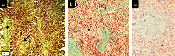 Fig. 5. (a) Marked necrosis in the lymphoid follicles of nodules (thick arrow) with depletion in these follicles (arrow) and deposition of collagen (arrow head) in the lymphoid tissue (10×; Masson’s staining). (b) Higher magnification. There is severe necrosis (arrow head) in the lymphoid cells, especially lymphocytes and reticular cells, with deposition of collagen (arrow) (40×; Masson’s staining). (c) Significant or marked collagen deposition (thick arrow) that is increased around the blood vessels and is also found along the lymphoid tissue. Also, there is depletion in the lymphoid follicles (arrow).