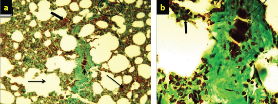 Fig. 6. (a) Multiple tumor masses (arrow) with papillary acinar structure (thick arrow) which extended within the lumen of alveoli (10×; H&E). (b) Papillary acinar structures with hyperplasia of alveolar calls (arrow) which lined the alveoli. Also, there is infiltration of macrophage (thick arrow) and lymphocytes (arrow head) in the pulmonary tissues (40×; H&E). However, the recorded clinical signs were nonspecific; major clinical signs were noted to give high suspicion to OPA; it usually reflects the extent of tumor development and devastation changes in the lungs. Marked dyspnea, mouth breathing (panting), and auscultation of moist rales were readily detected. Wheel-barrow test was carried out for assessed the accumulation of fluid within the respiratory tract by elevating the hindquarters and lowering the head of the animal, which lead to running frothy mucoid fluid from the nostrils (Ortín et al., 2019). The PCR results showed that 12 (16%) were positive, similar to the results of other studies (Vithana Dewage, 2020). The 545 nucleotide sequence analysis discloses that the current sequenced JSRV env gene has some genetic deviations from global isolates. The sequence of the local JSRV isolates showed significant differences from the strains of UK and India (EF680300.1 JSRV, 0.07) (KT279067.1: JSRV_isolate_NTRCVSc-3), respectively, and significant differences with strains from China (JX843793.1:JSRV_strain_SD and DQ838494.1:JSRV). Furthermore, the sequence showed significantly different values with JSRV of South Africa in sheep (AF153615.1) and the ENTV strain of China (MT254061.1) in goats that were 0.06 and 0.13, respectively. These results explained the relationship of Iraqi isolates with mutations in pro-gene structure but had no effect on the gene. The prevalence rate of the OPA disease study area was 12 (10.76%) out of 195 samples that were randomly selected from different herds. The results differed from those of a recent study conducted in Iraq (25%) (Mansour et al., 2019). The difference could be due to the later use of an unspecific primer in virus detection and the utilized lungs and lymph nodes tissues samples, which could lead to false positives with JSRV. Our study’s prevalence rate was similar to other studies in India (8%) (Sonawane et al., 2016), Iran (13.75%) (Bahari et al., 2016), and slightly lower from a study in Northwest Iran (18%) (Rezazadeh et al., 2012). There was a lot of diversity in the reports of OPA prevalence among Iraq and others countries which could be related to differences in location, source of material, nature of dissemination, management conditions, age of animal, season, and research duration. Furthermore, because OPA is a slow-moving virus with a prolonged incubation period, most animals infected with JSRV do not show clinical indications and remain subclinical or develop only a few lesions at the end of their life span. Most previous reports on the occurrence of OPA were purely based on gross and histological results, which could be one of the causes for our country’s low OPA rate (Radostits et al., 2017; He et al., 2017; Quintas et al., 2021). The results of this study indicated the association between the percentage of infection and the age of the investigated sheep, with the highest rate detected at 2–4 years, which is similar with other studies (Jassim et al., 2017; Beytut et al., 2009). Because OPA has a long incubation time, older sheep are more susceptible to infection than lambs. Singh et al. (2020) suggested that the sheep husbandry system and the period during which animals remained in direct contact, especially during the cooler months, may have a substantial impact on the occurrence of OPA. On postmortem examination, the dorsal portion of the caudal lobe of the lung was shown to be the most affected area of the lung. The general changes were similar to earlier OPA reports (Palmarini and Fan, 2001; Radad and Khalil, 2014; Belalmi et al., 2020; Toma et al., 2020; Mustafa et al., 2021). The histological examination was considered to have multiple foci of neoplastic proliferation involving alveolar and bronchiolar epithelium that were seen in sections from the consolidated areas of tumor nodules. In early lesions, the affected alveoli were highly irregular in shape and only involved a few alveoli. The histological abnormalities observed in all OPA-affected lungs in this investigation were consistent with previous findings (Belalmi et al., 2020; Toma et al., 2020; Mustafa et al., 2021). There were essentially two types of tumor cell development patterns observed: papillary and acinar or glandular. The alveolar wall was enlarged in a papillary pattern, and papillary projections of altered neoplastic epithelial cells, supported by a thin connective tissue stalk, partially or totally filled the alveolar lumen, which is in agreement with previous research (De las et al., 2021; Quintas et al., 2021). So, the nature of the virus and its influence on TYPE II pneumocytes, as well as the proliferation of these cells and the establishment of malignant tumors, is explained by changes in the infected lung tissue, as well as the infiltration of inflammatory cells in the area surrounding the tumors. The current study would provide useful data about surveillance and epidemiological features of JSRV circulating in the sheep population in Iraq, and concludes that epidemiological studies and control of disease may require multi-diagnostic methods, clinical signs, PCR, and gross and histopathological examinations to detect the presence of JSRV in infected animals with OPA. Authors’ ContributionsYahia I. Khudhair: structured the study design and conducted bioinformatics analyses. Falah A. Abass: animals’ examination, samples collection, hematological hypothesis, molecular study working and results’ interpretation, data collection, literature review, and manuscript preparation. All the authors contributed to manuscript preparation, and worded
