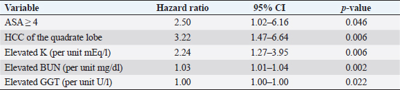 Table 2. Variables associated with overall survival in those 73 patients that underwent surgical resection for definitive treatment of HCC following multivariable Cox regression analysis.