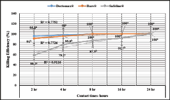 Fig. 1. In-vitro killing efficiency (%, mean ± SE) of the tested insecticides on ticks.