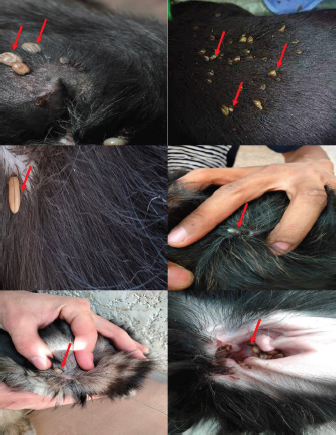 Fig. 2. Photographs of the experimental dogs after experimental infestations. Red arrows point to the ticks. Hematological profile of dogsThe hematological analysis reveals in Table 1 highly significant (p < 0.01) reductions in the overall means of RBCs, HCT, MCHC, and PLT in all groups treated with Doramectin (Dectomax®), Fipronil 50 mg/ml (Bars®), and phenylpyrazole–garlic–camphor mix (Safeline®) compared to the control with more concern toward the phenylpyrazole–garlic–camphor mix (Safeline®). The overall means concerning sampling time reveal in Table 1 highly significant (p < 0.01) reductions in all the measured hematological parameters in the 2-week (P1) and 4-week posttreatment (P2) samples compared to the zero-time samples with no significant differences between the two sampling times (P1 and P2) with more pronounced improvement in the hematological parameters in the 4-week posttreatment samples.