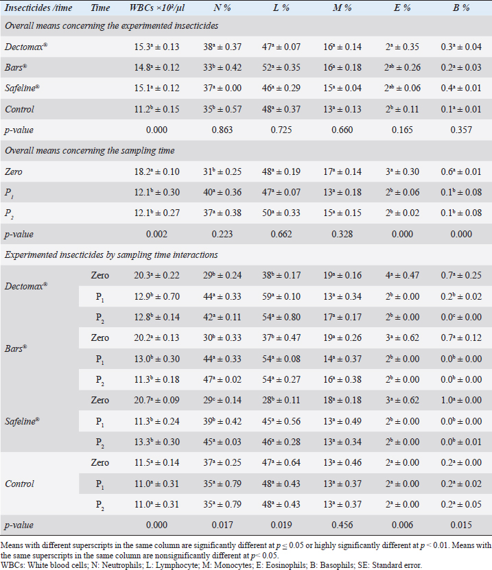 Herbal insecticides and acaricides include pyrethroids, neem, and various essential oils, as well as newly based insecticides, such as phenylpyrazole–garlic–camphor mix (Safeline®) that was used in our experiment. Although the herbal insecticide delayed in achieving 100% killing efficacy compared to the other two chemical insecticides, its safety is higher compared to other insecticides. Khare et al. (2019) revealed that the phenylpyrazole–garlic–camphor mix (Safeline®) disrupts the insect central nervous system by blocking GABA-gated chloride channels and GluCl channels. This causes hyperexcitation of contaminated insects’ nerves and muscles. Garlic and camphor oils reported by Krishnananda et al. (2017) and Shaji et al. (2017) inhibit the release of acetylcholinesterase which is essential for insects for their activity and synaptic transmission and act on octopamine (circulating neuromodulator) causing disruption and a complete breakdown of the nervous system in insects, and they are hydrophobic and cause water stress in insects by blocking the spiracles resulting in suffocation and distressing the cuticular waxes. Table 4. GLUCO and lipid profile overall means (mean ± SE) of infested dogs treated with different experimented insecticides.