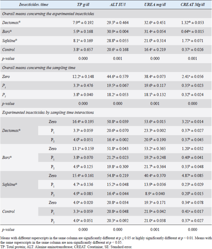 Fig. 4. Erythrocyte sedimentation (mean ± SE) of infested dogs treated with different experimented insecticides. (A) ESR overall means concerning experimental groups. (B) ESR overall means concerning sampling times. (C) ESR means concerning experimental groups by time interactions. Chemical insecticides have been considered as one of the traditional means used for a long time for insect control, despite the diverse ill effects they might contribute (Singh, 2010). The use of these insecticides has been investigated for the nontarget influence, resistance build-up, and long residual actions (Saeed et al., 2016; Pisa et al., 2021). Herbal eco-friendly insecticides have been researched to overcome all the disadvantages caused by chemical insecticides (Abd-Ella, 2013; Gil et al., 2015; Abd-Ella, 2016; Nettles et al., 2016). The systemic action of insecticides is important to minimize or completely eradicate external parasites like ticks and their vector-borne diseases like Babesia canis, Anaplasma phagocytophilum, and Ehrlichia canis (Honsberger et al., 2016; Jongejan et al., 2016). The current results showed a significant in-vitro efficiency of the three tested insecticides against R. sanguineus with 100% killing efficiency achieved after 8 hours in Doramectin (Dectomax®) and Fipronil 50 mg/ml (Bars®) and 24 hours in phenylpyrazole–garlic–camphor mix (Safeline®). The high insecticidal actions of the three tested insecticides are related to their deep structure and broad-spectrum neurological action on the insect. The same results were recorded by Taenzler et al. (2018), Becskei et al. (2016), Beugnet et al. (2016), Cherni et al. (2016), and Six et al. (2016) who determined the broad-spectrum action of many chemically based insecticides on R. sanguineus ticks, fleas of Ctenocephalides species, mites of Demodex species, sarcoptic mange from Sarcoptes scabiei, and ear mites from Otodectes cynotis. Padula et al. (2020) reported the importance of using effective antisera against ticks for obtaining full protection against their infestations in companion animals like dogs. Poché et al. (2017) recorded that insecticides containing Fipronil 50 mg/kg were able to reduce ectoparasitic infestations up to 95% from their original load after a single time treatment. Dolan et al. (2017) also recorded the ability of Fipronil in reducing ticks up to 76% following 9–17 weeks of treatment. At the chemical structure level, Doramectin (Dectomax®) is a macrocyclic lactone that acts as reported by Page (2018) by modulating chloride ion channel activity in the nervous system of nematodes and arthropods. Macrocyclic lactones bind to receptors that increase membrane permeability to chloride ions. This inhibits the electrical activity of nerve cells in nematodes and muscle cells in arthropods and causes paralysis and the death of the parasites. Fipronil 50 mg/ml (Bars®) is based on its chemical structure of Fipronil, diflubenzuron, and dicarboximide. Fipronil, according to Bonmatin et al. (2015), causes blocking of the GABA-dependent receptors of ectoparasites, impairing the transmission of nerve impulses, which leads to paralysis and death of ectoparasites. Diflubenzuron, as reported by Sankar and Kumar (2021), acts by inhibiting the synthesis of chitin in parasites and disrupting the molting, egg-laying, and hatchery process, which leads to an end to the replenishment of the population. Dicarboximide is a synergist and is used with insecticides to increase their activity. Dicarboximide, as reported by d’Errico et al. (2017), stops microsomal detoxification of the insecticide, increasing its toxicity for the parasite. The extensive use of chemical insecticides lead to resistance against these compounds in many of the arthropods and external parasites, and that is why new lines of insecticides had to be developed. This resistance is multifactorial and usually can be developed by several means through behavioral, biochemical, and metabolic ways (Cossío-Bayúgar et al., 2018; Thangam and Kathiresan, 2021). That is why molecular markers have been developed to target the nucleotide sequence and genes responsible for this resistance as sodium channels, acetylcholinesterase, carboxylesterase, β-adrenergic octopamine receptor, and octopamine–tyramine in the insect as reported by Kumar (2019) and Aguilar et al. (2018). Table 3. Liver and kidney functions (mean ± SE) of infested dogs treated with different experimented insecticides.