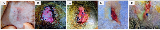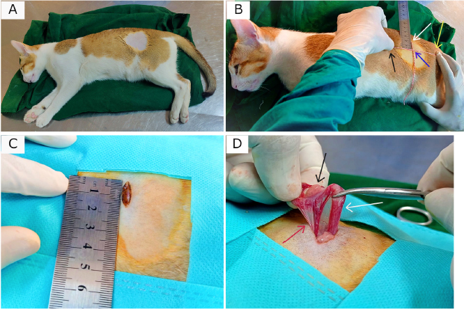Fig. 1. Surgical landmark to make incision to find out ovary and uterine horn for spaying in cat. (A) Cat in right lateral recumbency with left flank (shaved) upward. (B) Measurement of the point of incision (blue arrowed intersection point of two threads) between the last rib (black arrow) and hip joint (yellow arrow) having 2 cm distance from lumbar transverse processes (white arrow). (C) A skin incision of 1.5 cm. (D) Exteriorized uterine horn (white arrow) with ovary (black arrow) attached to the vascular pedicle (red arrow). Postoperative complications and managementsIn both groups, most of the casts did not show any complication (Fig. 3A) after surgery; however, some were found with wound site infection (Fig. 3B), dehiscence of suture lines (Fig. 3C), bleeding (Fig. 3D), and oozing (Fig. 3E) from the wounds. These postoperative complications were treated successfully by regular dressing of the wounds with Viodin® 10% solution for 5 days. However, Ceftriaxone [at] 35 mg/kg BW (Trizon Vet, ACME Laboratories Ltd., Dhaka, Bangladesh) for 7 days, Ketoprofen [at] 2.2 mg/kg BW (Ketovet, Techno Drugs Ltd., Narsingdi, Bangladesh) for 5 days and Pheniramine Maleate [at] 1 mg/kg BW (Antihista-Vet®, Square Pharmaceuticals Ltd., Dhaka, Bangladesh) for 7 days along with oral Vitamin-C supplements for 14 days were maintained postoperatively for all the cats for better healing and complete recovery. After spaying, the skin wounds of all the cats in both groups were completely healed within 1–3 weeks depending on the absence or presence of complications. Statistical analysisThe data obtained from this experiment were calculated as “mean ± standard error” and percentage (%) for all the cats in both Group A and Group B. Independent Samples t-tests were performed for data analysis using IBM SPSS Statistics (Version 22) to compare the means of parametric variables (i.e., age, BW, skin incision length, total surgical duration, the time needed for ligating ovarian pedicles and uterine body, suture materials, and healing duration) between the groups. p < 0.05 was considered as statistically significant for the tests. Ethical approvalThis experimental methodology was approved by the Animal Welfare and Experimentation Ethics Committee of Bangladesh Agricultural University (Approval No. AWEEC/BAU/2022-12).