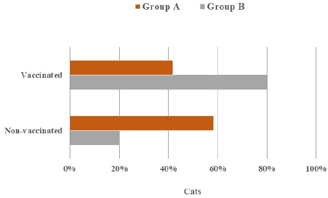 Fig. 4. Clustered bar chart showing the percentages of vaccinated and non-vaccinated cats in Group A and Group B. For ovariohysterectomy in cats, the recommended length of the incision for the lateral flank approach is 2–3 cm (Coe et al., 2006; Rana, 2007; Babu et al., 2018), and about 1.5–2.5 cm long skin incisions were used for ovariohysterectomy in this research being comparatively shorter than the incision length for ventral midline approach (Ghanawat and Mantri, 1996; Rana, 2007). Freeman et al. (1987) reported that an initial 6 cm long midline incision was used for spaying, whereas Coe et al. (2006) observed relatively smaller incision for the same purpose and stated that it was rarely necessary to extend the incision size in flank approach to find out the uterus, and having longer incision, it would take comparatively a short time for the operation. Although larger incisions may facilitate better exposure for locating the uterine horns and body, it might induce increased possibility of surgical trauma and hemorrhage with the greater requirements of suture materials to deal with the situations. The body weight of the female cats selected for spaying is harmonious with those of the studies of Verstegen et al. (2008) and Murugesan et al. (2020), while the suturing techniques are in compliance with the findings of Kiani et al. (2014), Omeran et al. (2014), Babu et al. (2018), and Murugesan et al. (2020). Left lateral site incision is preferred for flank approach (McGrath et al., 2004), and several incision patterns (i.e., horizontal flank incision, vertical flank incision, and oblique flank incision) are reported for spaying in cats (Hoque, 1991; Babu et al., 2018). Meanwhile, this research observed the vertical incisions applied on the left lateral flank of the cats. Flank approach was selected for the female cats because of several advantages. Holly and Hardie (2004), McGrath et al. (2004), and Kiani et al. (2014) observed that queens with excessive mammary development due to lactation or mammary gland hyperplasia should be considered for the flank approach as it provides the ease of observing the surgical wound from a distance ensuring the prevention of leakage, hemorrhage and inflammation from adjacent tissues after the operation, and reduces the risks of evisceration if wound dehiscence occurs. Hence, these justifications might be the reasons for the occurrences of neither bowel evisceration nor severe wound complications after spaying of the queens in this study followed by the privilege of effective postoperative managements. On the contrary, flank ovariohysterectomy may provoke some definite complications involving the difficulties in exteriorizing and removing the whole uterine body up to the cervix, chances to drop and loss the ovarian pedicle in the cavity before ligating during operation which may be hard to get back again, and the inconveniences to get the exposure of the opposite ovary as well as the uterine bifurcation sometimes (Ghanawat and Mantri, 1996; Fingland, 1998; Hedlund, 2002; Stone, 2003). According to Kaini et al. (2014), the midline approach is usually selectable for spaying in those cases where either the uterus cannot be accessed from the flank approach, or confusions may arise from other technical errors to ascertain an already spayed cat. In case of uterus unicornis being an unusual congenital defect, the flank approach is considered inferior to handle the condition (Murugesan et al., 2020). In addition, Gorelick (1974) found the discoloration of regrown hairs in some cats after pre-surgical clipping or shaving predominantly with flank spaying. However, this study did not observe such kind of complications and difficulties during the surgical procedure of ovariohysterectomy in the queens. This might be due to very skillful procedures to operate the cases, and presence of no anatomical and developmental abnormalities in the cats.