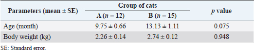 AbstractBackground: Spaying is considered a reliable surgical method for birth control and preventing potential feline reproductive diseases. Aim: This experiment was carried out to evaluate the suitability of the left lateral flank approach for routine spaying in cats. Methods: Twenty-seven queens of 7–24 months old and 1.5–3.5 kg body weight (BW) were spayed through flank laparotomy on the left lateral side of the abdomen. The cats were categorized into two groups: Group A (n=12; cats did not yet give birth) and Group B (n=15; cats gave birth before). The studied variables included age, BW, vaccination history, skin incision length, total surgical duration, the time needed for ligating ovarian pedicles and uterine body, suture materials, postoperative complications, and healing duration. Results: There were no significant differences (p < 0.05) in age, BW, and vaccination history of the cats between the two groups. The mean incision length and total duration of surgery were greater in the case of Group B than in Group A. The ease of entering into the peritoneal cavity, duration of ligating the ovarian pedicles, and transfixing the uterine body did not vary significantly (p < 0.05) between the groups although a longer time was taken for Group B than Group A. 62.96% spayed cats were found with no postoperative complication. The observed complications included wound site infection (7.41%), dehiscence of suture lines (11.11%), bleeding (3.70%), and oozing (14.82%) from wounds which were further treated successfully for complete recovery. Conclusion: Left lateral flank approach can be an effective method of spaying in queens without any life-threatening complications. Keywords: Ovariohysterectomy, Flank celiotomy, Ligation, Postoperative complication, Queens. IntroductionUnwanted domestic and stray cats are a global problem as it gives rise to various issues of cat welfare (Kiani et al., 2014; Roberts et al., 2015). Spaying is the most common surgery performed in female cats as a means of population control (Levy and Wilford, 2013; Murugesan et al., 2020) which involves removing both the ovaries and uterus called ovariohysterectomy, and sometimes only the ovaries are surgically removed (ovariectomy) for sterilization (Omeran et al., 2014). Apart from only birth control, spaying stamps out the incidences of pyometra, metritis, dystocia, uterine torsion, localized or diffuse cystic endometrial hyperplasia, uterine rupture, uterine neoplasia, mammary tumors, and many other reproductive disorders (Stone, 2003; Murugesan et al., 2020). It also decreases the rate of pseudopregnancy and increases the longevity of animals (Michell, 1999; Kiani et al., 2014). Cats usually exhibit their first heat (estrus) around 6 months of age (White, 2012). In cats, the behavioral signs of estrus (i.e., frequent and irritating vocalization, head rubbing to owners, rolling on the floor, tail deviation, treading, nymphomania, and lordosis), very short inter-estrus interval, and chances of conceiving frequently initiate the pet owners to go for ovariohysterectomy (Heffelfinger, 2006; Nelson and Couto, 2014; Oliveria et al., 2014). Elimination of estrus is often required to check vaginal bleeding, behavioral changes, the attraction of males, and undesired mating (Valle and Junior, 1999). Estrus-influenced female sexual behaviors in cats can be completely suppressed by ovariohysterectomy or ovariectomy with or without changes in the nonsexual behaviors (Hart and Eckstein, 1997; Sontas and Ekici, 2007). Usually, feline ovariohysterectomy is performed either through a ventral midline approach or a lateral flank approach (Babu et al., 2018; Murugesan et al., 2020). The flank approach being a substitute for the traditional ventral midline approach for spaying is found to be preferred in the UK, and the midline approach is popular in the USA (Coe et al., 2006; Kiani et al., 2014). The ventral midline approach is recommended when the female cats are pregnant or in various uterine pathological conditions although there may be more hemorrhage and chances of wound infection due to the ventral position, and the wound complications are often difficult to get notified (Babu et al., 2018). Hence, a lateral flank approach is preferred by many veterinarians for ovariohysterectomy in cats. The cost and duration involved in the procedures of ovariohysterectomy largely depend on incision length, closure of the muscles and skin, and for that reason, it is needed to follow such a surgical technique that can be practiced in the least invasive way, e.g., involvement of minimum incision, trauma, and suture materials with short duration. Therefore, this research was conducted to justify the left lateral flank approach as a minimally invasive surgery for regular spaying in cats focusing on better healing with minimum complications. Materials and MethodsThis research work was carried out from May 2021 to March 2022 in the Veterinary Teaching Hospital of Bangladesh Agricultural University to execute spaying in female cats through celiotomy in the left lateral flank. Experimental animalsThis research work included 27 female cats of 1.5–3.5 kg body weight (BW) and aged 7–24 months, which were brought to the Veterinary Teaching Hospital to spay for birth control. Before the surgery, the cats were thoroughly checked whether they had any estrus, pregnancy, or other systemic diseases, and found to be healthy having no such kind of incidences. In addition, the queens were recommended to be fasted for 16 hours before spaying to prevent anesthesia-related complications. Experimental groupsFor this experiment, the queens were categorized into two groups: Group A and Group B. Group A consisted of 12 female cats that did not give birth to kittens yet, whereas 15 cats that gave birth before were included in Group B. Studied particulars of the catsIn both groups, the recorded data from the cats were based on age, BW, and vaccination history for cat fl