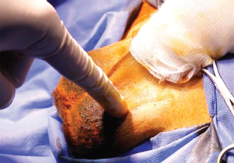 Fig. 1. Vasectomy reversal surgery performed in a captive lion (P. leo). Vasectomy site was accessed through the previous scar localized in the lower groin under the level of the external inguinal ring.
