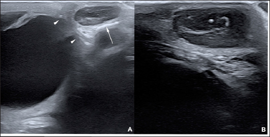 Fig. 3. Ultrasonographic images obtained in Case 2 in a longitudinal (temporo-nasal) orientation. The temporal side is on the right of each image. (A) General view showing the relationship with the globe (white arrowheads) and the zygomatic arch (white arrow). (B) Close-up view showing the described architecture and echogenicity. Surgical procedure and postoperative treatmentCase 1 The filly was hospitalized for surgical excision and histopathological analysis of the mass (VPG Histology, Synlab Laboratory, UK). Premedication was carried out with intramuscular acepromazine (0.1 mg/kg, Placivet®, Kela) and intravenous xylazine (0.6 mg/kg, Proxylaz®, Prodivet). General anesthesia was induced with an intravenous combination of ketamine (2.2 mg/kg, Ketamidor®, Richter Pharma) and midazolam (0.06 mg/kg, Midazolam®, Mylan) and was maintained on isoflurane (Isoflo®, Zoetis). The filly received intravenous flunixin meglumine (1.1 mg/kg, Emdofluxin®, Emdoka) and trimethoprim-sulfadiazine (30 mg/kg, Emdotrim®, Emdoka) preoperatively. A 5 cm longitudinal skin incision was made centered on the mass and subcutaneous tissues were dissected from the mass using Stevens scissors (Fig. 4). The dissection was uncomplicated as the mass was well encapsulated and there was no adherence to the adjacent tissue. The deep and subcutaneous tissues were closed in a continuous pattern with 5–0 polylactic acid (Vicryl, Ethicon) and the skin was in a simple interrupted pattern with 4–0 polyethylene (Ethilon, Ethicon). Postoperative care consisted of oral administration of trimethoprim-sulfadiazine (30 mg/kg, Emdotrim®, Emdoka) twice a day for 5 days, meloxicam (0.6 mg/kg, Metacam®, Boehringer Ingelheim) once a day for 3 days, and omeprazole (1 mg/kg, Ulcergold®, Norbrook Lab) once a day for 5 days.