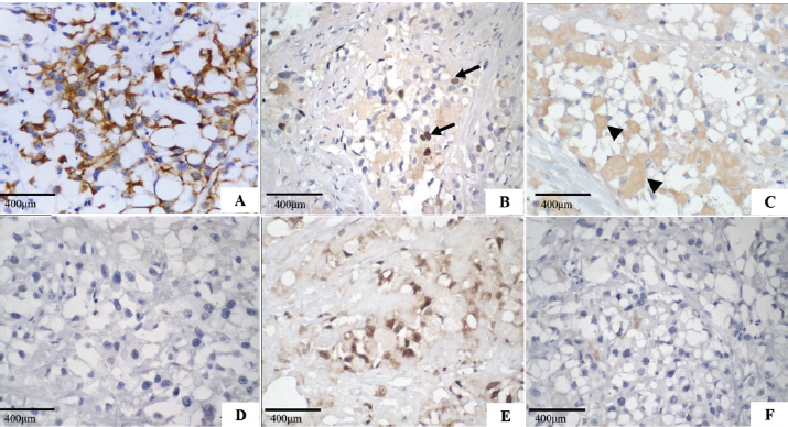 Fig. 2. Secretory carcinoma of the canine mammary gland, Immunohistochemistry. (A): Positive membrane labeling for pancytokeratin (AE1/AE3), which confirms the epithelial component of the neoplasm (IHC, 200×). (B): Nuclear labeling for Ki-67 (MIB-1) in 40% of neoplastic cells (arrow) (IHC, 400×). (C): Cytoplasmic labeling for alpha-lactalbumin, of intracytoplasmic and extracytoplasmic secretion (arrowhead) (IHC, 400x). (D): Negative oestrogen. (E): Nuclear labeling for progesterone. (F): Negative control for hormone receptors (400×). The morphological characteristics of the neoplasm described in this work are similar to those of mammary gland secretory carcinoma described in a female dog (Cassali et al., 1999), and in women (Suzuki et al., 1999; Vasudev and Onuma, 2011). It presents an infiltrative characteristic with solid and/or tubular proliferation and contains spaces full of eosinophilic secretion. The neoplasm presented here is also composed of cells with granular cytoplasm, clear eosinophilic, and prominent vacuoles that displace the nucleus to the periphery, resembling signet-ring cells. In women, microcystic, cystic, solid, and papillary patterns are observed histologically (Li et al., 2012; Din et al., 2013). However, in veterinary medicine, both the 1999 case (Cassali et al., 1999) and the one reported here, showed a solid organization. The intracytoplasmic content of secretory carcinoma cells is PAS-positive (Cassali et al., 1999; Suzuki et al., 1999; Din et al., 2013; Sharma et al., 2015), which was observed in this study, whereas in cells involved in lipid- and glycogen-rich carcinomas, PAS and diastase were negative (Cassali et al., 1999; Cassali et al., 2014). In contrast, mucinous carcinoma secretions are positive for PAS, diastase, and Alcian Blue in at least 40% of its growth, and mucin accumulation is predominantly located in the intraductal component (Cassali et al., 2014), which was not observed in this case. Alpha-lactalbumin is a diastase-resistant protein that is different from what is observed for glycogen, and intracytoplasmic evidence allows the diagnosis of secretory carcinoma (Cassali et al., 1999; Vasudev and Onuma, 2011; Cassali et al., 2014). The IHQ characterization in the present case is similar to that previously described in dogs and women (Cassali et al., 1999; Suzuki et al., 1999; Vasudev and Onuma, 2011; Din et al., 2013; Sharma et al., 2015) with positive immunolabeling for cytokeratin and alpha-lactalbumin and negative ER. However, PR differs from some cases reported in humans (Li et al., 2012; Sharma et al., 2015; Banerjee et al., 2021) and is correlated with tumor-favorable biological behavior. Ki-67 was expressed in 40% of neoplastic cells, which was not seen on the HE, because most of the neoplastic cells were in interphase; this case indicates a high rate of cell proliferation, which implies a more aggressive biological behavior and, consequently, poor prognosis. The prognosis in humans is generally favorable (Horowitz et al., 2012; Banerjee et al., 2021), with indolent clinical behavior (Li et al., 2012), and a low chance of metastasis when the tumor size is <2 cm (Li et al., 2012; Trost et al., 2014). However, it may behave more aggressively in adults than in children (Suzuki et al., 1999; Li et al., 2012). In contrast to a previous report in veterinary medicine (Cassali et al., 1999), the dog in the present study was 10 years old, which, using an age conversion table (Lebeau, 1953), corresponding to a 56-year-old woman. The tumor also had a long axis of 8 cm and high Ki-67 labeling, which may be associated with worse outcomes. The survival of the bitch in the present study (133 days post-surgery) was 83 days longer than that observed in the first report of such neoplasia in dogs (Cassali et al., 1999), but significantly lower than those found in reports of mammary gland-lipid-rich carcinoma (Espinosa De Los Monteros et al., 2003; Perossi et al., 2019), which may indicate an even more aggressive biological behavior in dogs (Tei et al., 2012; Perossi et al., 2019). Up until now, this is the second report of canine mammary gland secretory carcinoma and the first report of bone metastasis, which suggests the aggressive behavior of this neoplastic type in such species. Furthermore, secretory carcinoma must be included in the differential diagnosis of canine mammary gland carcinomas, showing cellular morphological characteristics of intracytoplasmic vacuolization and eosinophilic secretion. Conflict of interestThe authors declare that there is no conflict of interest. Authors’ contributionsHalana do Carmo Silva, Mayra Cunha Flecher, Geovani Dantas Cassali, Tayse Domingues de Souza, Adriano Lima Stelzer Bindaco and Ana Carolina de Jesus Pinto performed the cytological, necropsy and histopathological description. Geovani Dantas Cassali and Fernanda Rezende de Souza performed immunohistochemistry. Bruna Voltolin de Sena and Rodrigo dos Santos Horta were oncologists. Halana do Carmo Silva, Mayra Cunha Flecher, Marina Possa dos Reys, Tayse Domingues de Souza and Rodrigo dos Santos Horta wrote the manuscript. All authors reviewed the manuscript and made important contributions to the manuscript. ReferencesAktepe, F., Sarsenov, D. and Özmen, V. 2016. Secretory carcinoma of the breast. J. Breast. Health. 12, 174–176. Banerjee, N., Banerjee, D. and Choudhary, N. 2021. Secretory carcinoma of the breast commonly exhibits the features of low grade, triple negative breast carcinoma- a case report with updated review of literature. Autops. Case. Rep. 11, 202–227. Cassali, G.D., Gobbi, H., Gartner, F. and Schmitt, F.C. 1999. Secretory carcinoma of the canine mammary gland. Vet. Pathol. 36, 601–603. Cassali, G.D., Jark, P.C., Gamba, C., Damasceno, K.A., Estrela-Lima, A., De Nardi, A.B., Ferreira, E., Horta, R.S., Firmo, B.F., Sueiro, F.A.R., Rodrigues, L.C.S. and Nakagaki, K.Y.R. 2020. Consensus regarding the diagnosis, prognosis and treatment of c