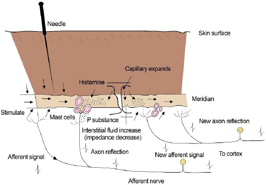 AbstractThe practice of acupuncture is becoming increasingly popular in veterinary medicine, especially as a method of providing pain relief. Originally based on principles derived from centuries of observation, conventional scientific mechanisms of action for acupuncture as a pain-relieving modality have recently been elucidated. Acupuncture points allow access to multiple regions of the body via the peripheral nervous system and its connection with the central nervous system. Local, segmental (spinal), and suprasegmental (brain) effects of acupuncture involve enhanced release of pain-relieving endogenous substances (e.g., opioids) and mitigated release of pain-inducing substances (e.g., inflammatory cytokines). In addition, there is evidence that acupuncture can induce positive neurochemical and cytoarchitectural change in the central nervous system via the phenomenon of neuroplasticity. Electroacupuncture is considered the most effective type of acupuncture delivery, allowing for more potent and long-lasting pain relief than is achieved via other methods (e.g., dry needling). The purpose of this review article is to summarize the relevant scientific literature from the last two decades relating to the physiological mechanisms of action of acupuncture as a pain-relieving modality. Keywords: Animal, Acupuncture, Electroacupuncture, Pain, Veterinary medicine. IntroductionThe appeal of acupuncture as a pain-relieving therapy is expanding in veterinary medicine. The practice of acupuncture in veterinary medicine is thousands of years old (Xie and Chrisman, 2009); however, recent experimental and clinical studies have shown both specific biological effects and measurable clinical benefits of acupuncture. Many of these studies have been carried out in laboratory animals and humans with painful conditions, but much of the knowledge from this literature can be applied to veterinary practice (Soligo et al., 2013; Cheng, 2014; Chen et al., 2014a,b; Fry et al., 2014; Zhou and Benharash, 2014; He et al., 2015; Kim et al., 2020). In addition to these investigations, some of the clinical studies demonstrating acupuncture efficacy for pain relief have been conducted in companion animal species (Xie et al., 2001, 2005, 2009; Skarda and Muir, 2003; Rungsri et al., 2009; de Sousa et al., 2012; Chomsiriwat and Ma, 2019). One of the barriers to integrating acupuncture into modern practice is a commonly held perception that it is based on archaic principles, rather than accepted (Western or contemporary) medical science. The individuals who developed acupuncture thousands of years ago did not have the tools at the disposal of contemporary clinicians to ascertain the true structural and functional properties of their patients. The medical system that they envisioned – the system upon which acupuncture was originally implemented – was based upon centuries of observations. It was also based upon logical conclusions that were derived from those observations. In many cases, the metaphorical terminology of traditional Chinese veterinary medicine can be effectively “translated” into conventional medical terms (Soligo et al., 2013; Xie and Preast, 2013; Cheng, 2014; Zhou and Benharash, 2014). Acupuncture includes manual acupuncture or “dry needling” (DN), aquapuncture, moxibustion, and electroacupuncture (EA). Aquapuncture and moxibustion may have a greater therapeutic effect than DN. Presumptive mechanisms for aquapuncture’s efficacy include enhanced stimulation of the injected acupuncture point via spatial distortion of the injected substance and pharmacologic effects of the injected substance. Moxibustion entails heating the acupuncture needles with a burning stick of dried mugwort plant (Artemisia vulgaris); heating the acupuncture needles is thought to induce a greater stimulation to the acupuncture point than would be achieved with DN alone. It is generally accepted that the clinical effects of EA are more potent and longer lasting than DN, aquapuncture, or moxibustion (Xie et al., 2009; Soligo et al., 2013; Xing et al., 2013; Chen et al., 2014a; Fry et al., 2014; Zhou and Benharash, 2014; Lu et al., 2015). Acupuncture points and meridiansRecent expansion of knowledge pertaining to the scientific basis of acupuncture is due mainly to advances in neuroimaging and molecular biology techniques. An acupuncture point can be envisioned as an anatomic unit that comprises free nerve endings, small arterioles, venules, lymphatics, and mast cells (Fig. 1). Acupuncture points may be larger than “points” and more accurately described as receptive regions or fields in the vicinity of the “point”. Acupuncture points are usually found physically in areas of surface depressions and physiologically in cutaneous regions typified by low electrical impedance and high electrical conductivity (Fry et al., 2014; Zhou and Benharash, 2014; Zhang et al., 2014; Pei et al., 2016; Lim et al., 2018; Kim et al., 2020). A high concentration of gap junctions has been demonstrated in cellular components of acupuncture points, which may partially explain the enhanced conductivity of bioelectrical signals in these regions. Nitric oxide (NO), a prevalent biological signaling molecule, has been shown to enhance conduction of electrical signals across gap junctions (Sheng-Xing, 2017). Subepidermal nerve fibers and dermal connective tissue cells associated with acupuncture points versus non-acupuncture points have been shown to have increased levels of neuronal NO synthase (nNOS) levels and higher concentrations of transient receptor potential vanilloid type-1 (TRPV-1) receptors (Sheng-Xing, 2017). TRPV-1 receptors are cation channels known to be integral to pain transmission. These receptors are particularly prevalent in small diameter C fibers, which are important for pain conduction from the periphery to the central nervous system (CNS). Experimentally, the expression of both nNOS and TRPV-1 at acupuncture sites is enhance