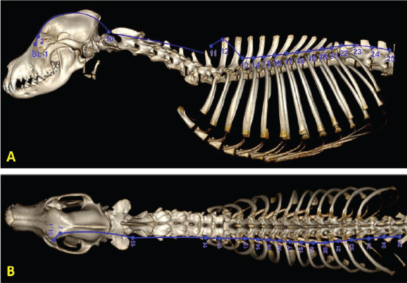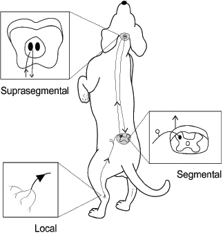 Fig. 2. Three-dimensional computed tomographic (CT) reconstruction showing the individual points and trajectory of the bladder meridian from lateral (A) and dorsal (B) views. Note how this meridian is aligned with the sympathetic chain. (CT image courtesy of Fred Wininger VMD, DACVIM-Neurology.) The analgesic effects of acupuncture can be conceptually divided into local, segmental (spinal), and suprasegmental (brain) effects (Fig. 3). Each of these divisions reflects a component of the nociceptive pathway. Local effects involve sensory afferents of tissues being stimulated (with neuronal cell bodies located in dorsal root ganglia). Segmental effects are associated with neurons located in the dorsal gray column of the spinal cord segments. These neurons provide ascending nociceptive tracts to the brain after being stimulated by sensory afferents. Suprasegmental (brain) effects correspond to a descending pain-mitigating system arising from several areas in the brain. These brain regions – when stimulated – send signals to the dorsal gray column neurons of the spinal cord, inhibiting their ability to provide ascending pain signals to the brain (Quandt and Dewey, 2019). Local effects of acupunctureAcupuncture is considered a method of counterirritation that provides sensory stimulation to local tissues. After providing a stimulus to the tissue with a needle, a local reaction is instigated that elicits several anti-inflammatory and immune responses. Acupuncture induces several physiological effects peripherally which contribute to pain relief. Many of these processes involve endogenous opioids (Zhao, 2008; Soligo et al., 2013; Xing et al., 2013; Cheng, 2014; Chen et al., 2014b; Fry et al., 2014; Zhang et al., 2014; Lim et al., 2018; Fan et al., 2019). Acupuncture induces local release of endogenous opioids from lymphocytes, macrophages, and granulocytes into tissue. These opioids then suppress the propagation of nociceptive signals by acting at receptors of the peripheral nerves in the tissue (Zhang et al., 2014; McDonald et al., 2015). Peripheral sympathetic nerve fibers are also activated, leading to increased levels of endogenous opioids in the region. Some of this effect is via adrenergic receptor activation of inflammatory cells, which causes them to release β endorphin into the tissue. Sympathetic nerve fiber activation also leads to increased expression of specific intracellular adhesion molecules in blood vessels of inflamed tissue. These adhesion molecules promote migration of neutrophils and mononuclear cells that contain β endorphin and met-enkephalin (Zhang et al., 2014). Acupuncture stimulation causes increased levels of cannabinoid CB2 receptors in tissue, which leads to upregulation of endogenous local opioids (Zhang et al., 2014). Acupuncture has the effect of decreasing levels of local inflammatory cytokines, including tumor necrosis factor-α (TNFα), interleukin 1β (IL-1β), and interleukin 6 (IL-6). This is also believed to involve endogenous opioids (Chen et al., 2014). Another local effect of acupuncture is the inhibition of cyclooxygenase-2 (COX-2) and prostaglandin E2 (PGE2) production in the region being stimulated (Zhang et al., 2014; Yen et al., 2019). Elevated tissue levels of nerve growth factor (NGF-a neurotrophin) have been associated with local inflammation; electroacupuncture has been shown to decrease NGF levels in inflamed tissue (Soligo et al., 2013). Acupuncture stimulation leads to upregulation of TRPV-1 receptors in peripheral nerve endings, which has been associated with an analgesic effect (Sheng-Xing, 2017; Yen et al., 2019). Local tissue release of purine neurotransmitters ATP and adenosine via acupuncture stimulation has both direct and indirect analgesic effects (McDonald et al., 2015; Fan et al., 2017; Lim et al., 2018; Yen et al., 2019; He et al., 2020).