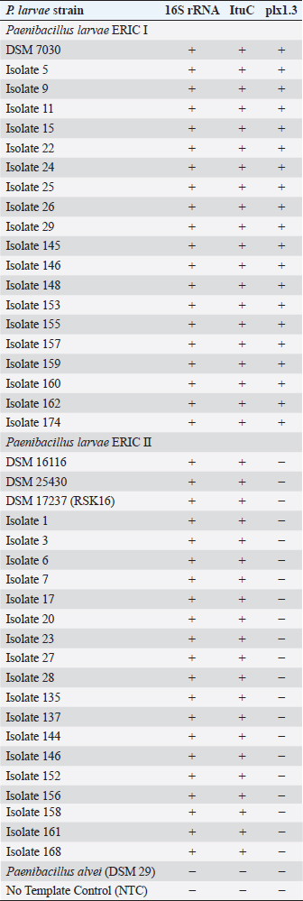 AbstractBackground: American Foulbrood (AFB) is a devastating disease of honey bee (Apis mellifera) larvae caused by the spore-forming, Gram-positive bacterium Paenibacillus larvae. In most countries, the law requires mandatory reporting of AFB to the veterinary authority. Aim and Methods: To speed up detection and genotyping of P. larvae spores, we compared different culturing protocols on Columbia sheep blood agar and developed a new multiplex quantitative polymerase chain reaction to distinguish between the two relevant P. larvae genotypes enterobacterial repetitive intergenic consensus (ERIC) I and ERIC II. Results and Conclusion: As confirmed by P. larvae reference strains and field isolates, the new identification and genotyping protocol halves the time of current workflows, lessens labor-intension, allows a higher throughput of samples for monitoring, and permits a faster intervention to prevent the spread of AFB. Keywords: American Foulbrood, ERIC genotyping, Multiplex quantitative PCR, Paenibacillus larvae, Rapid detection. IntroductionPaenibacillus larvae, a Gram-positive, rod-shaped, flagellated and spore-forming bacterium, is the etiological agent of American Foulbrood (AFB), a deadly brood disease of honey bees (Apis mellifera) (Genersch, 2010). The infection starts with the oral uptake of P. larvae endospores by bee larvae below 36 hours of age (Yue et al., 2008). The transmission of the extremely resilient and long-lived spores within or between bee colonies occurs by contaminated adult bees and spore-containing larval food. However, bee keepers contribute to the spread of AFB by feeding contaminated honey, moving diseased hives, or using contaminated equipment (von der Ohe et al., 1996, 1997a, 1997b; Genersch, 2010). The P. larvae spores remain infectious for several decades, are resistant to heat and antibiotics, and about 10 are sufficient to infect and finally kill a larva (Woodrow and Holst, 1942; Genersch, 2010). After germination of spores, vegetative cells of P. larvae massively proliferate in the larval midgut and later invade the haemocoel. The bee larvae subsequently disintegrate into a ropy mass which dries down to a spore-containing, highly contagious scale. With the progress of the disease fewer bees reach adulthood and the population of the hive collapses (Yue et al., 2008; Genersch, 2010; Fünfhaus et al., 2013). Until now five genotypes, P. larvae enterobacterial repetitive intergenic consensus (ERIC) I–V, have been identified based on ERIC sequences (Genersch and Otten, 2003; Genersch et al., 2006; Beims et al., 2020). While P. larvae I and II are frequently isolated from AFB-infected colonies, the genotypes ERIC III and IV have not been isolated in the recent years (Genersch, 2010; Ebeling et al., 2016), whereas genotype ERIC V was isolated in 2013 from a honey sample, without having information about the effected colonies (Beims et al., 2020). ERIC I and II isolates differ in endospore resistance, rate of sporulation, and the strategy and time they need to kill their hosts (Genersch and Otten, 2003; Genersch et al., 2005, 2006; Poppinga et al., 2012; Fünfhaus et al., 2013; Beims et al., 2015; Morrissey et al., 2015). Therefore, it is crucial to discriminate the slow killing phenotype of ERIC I (12 days) and the fast killing phenotype of ERIC II (7 days) (Genersch, 2010). Moreover, genotyping is necessary to refine AFB epidemiology and outbreak management (Morrissey et al., 2015). However, methods for genotyping like MLVA still exist (Descamps et al., 2016), but the main routine diagnostic is based on P. larvae detection without any epidemiological information. Our method allows to distinguish between the slow (ERIC I) and the fast killing (ERIC II-V) genotypes, which increases the diagnostic information. The high contagiousness and the severity of AFB are the reasons why this most devastating bacterial infection of honeybees is subjected to registration in many countries. Since the current treatment options for bee colonies suffering from AFB are very limited, it is very important to timely identify outbreaks and to confirm the source and routes of disease transmission (von der Ohe et al., 1997a, 1997b; Morrissey et al., 2015). Traditionally, the glue-like larval remains that can be drawn out as a thread with a matchstick represent a first-line warning practice of beekeepers (De Graaf et al., 2006). Further clinical symptoms of AFB are diverse and depend on the genotype, the stage of disease, and the strength of the bee colony. Visible signs may include a patchy brood pattern, concave and perforated cell cappings, and flat scales tightly attached to the lower brood cell wall. Moreover, severely infected colonies emit a rotten odor (De Graaf et al., 2006). However, obvious symptoms often need up to 3 years to develop and similar clinical signs can result from other bee diseases (von der Ohe et al., 1996, 1997a, 1997b). According to this pathogenic development, colonies can be separated into uninfected ones, which do not harbor spores of P. larvae, and infected ones. These infected colonies might not show any visual symptoms in the first stages of infection, whereas spores of P. larvae can be detected in different matrices of the hive, i.e., food and comb material. Not till then, when P. larvae spread among the colony and a critical number of spores is reached, typical symptoms of AFB can be detected. In the past decades, considerable progress has been made in the taxonomic reclassification of P. larvae and in the diagnosis of AFB (Ash et al., 1991; Govan et al., 1999; Genersch and Otten, 2003; Genersch et al., 2006; Morrissey et al., 2015; Ruiz-Villalba et al., 2017). Moreover, several sensitive and selective culture media and molecular techniques have been developed (De Graaf et al., 2006; Amtliche Methodensammlung, 2017; Rossi et al., 2018). Since cultural methods need confirmation by isolate identification, numbers of 16S rRNA-based polymerase chai
