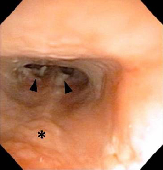 Fig. 2. Retrograde rhinoscopy for the nasopharynx. Nasal discharge (arrowheads) and slight swelling of the nasopharyngeal mucosa (asterisk) were detected.
