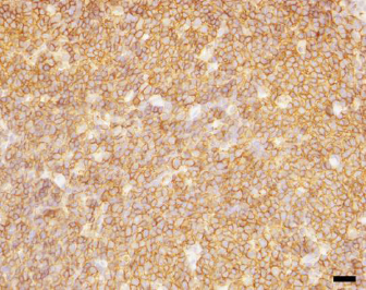 Fig. 4. Immunohistochemical analysis for CD20 of the nasopharyngeal mucosa. Most neoplastic cells were positive for anti-CD20 antibody (Bar=20 μm). No masses, local invasions in the nasal cavity, or metastases were found in the cat; therefore, the nasopharyngeal B-cell lymphoma in the cat was considered stage I lymphoma manifesting as a single tumor or localized in a single anatomic area (Moore, 2013). Because there were no masses in the cat, multidrug chemotherapy, but not radiation therapy, was proposed to the owner; however, the owner did not provide consent for it. Alternatively, although chlorambucil and prednisolone were considered, chlorambucil (Leukeran; Aspen Pharma, Baar, Switzerland, 2 mg/m2 q24h) without prednisolone was initiated on day 25 based on the owner’s request. Bacterial culture and antimicrobial susceptibility tests identified enrofloxacin-sensitive P. aeruginosa in the nasal discharge. The cat had already been administered with enrofloxacin on days 1–3; therefore, further antibiotics were not used. On day 36, the frequency of sneezing had decreased to two to three times/day, and nasal discharge and epistaxis were rare. The dosage of chlorambucil was, therefore, reduced to 2 mg/m2 q48h. Subsequently, the nasal signs were further improved with the treatment. To monitor the progression of nasopharyngeal lymphoma and possible adverse events associated with chlorambucil, physical and clinical examinations, including blood tests, radiography, and ultrasound, were carried ouin the cat every 2–3 months. However, no abnormalities and no adverse events had been observed in the treatment period. On day 754, the cat was administered with the same dosage of chlorambucil and remained in good condition. DiscussionAlthough nasal irrigation with saline or administration of enrofloxacin might have contributed to the short-term resolution of clinical signs, chlorambucil was considered to enable a cat’s long-term management of nasopharyngeal B-cell lymphoma without masses. No adverse events were observed in the cat in the period of the treatment with chlorambucil. A previous study reported that no masses were evident in 28% of cats with nasal or nasopharyngeal lymphoma manifesting as a rough thickened mucosa (Santagostino et al., 2015), indicating that nasal and nasopharyngeal lymphomas without masses are not uncommon in cats. Although the effect of combined chlorambucil and prednisolone was not evaluated in this case, the present report suggests that at least chlorambucil can be a therapeutic option for feline nasal and nasopharyngeal lymphomas without masses. The cat in this case report was diagnosed with nasopharyngeal large B-cell lymphoma based on histopathological and immunohistochemical analyses. Large-cell lymphomas tend to behave aggressively and develop as enlarged neoplasm in the tissue. However, rhinoscopy and diagnostic imaging with radiography, ultrasound, and CT revealed no masses, local invasions, or metastases to the local lymph nodes and other tissues or organs in the cat, suggesting that nasopharyngeal lymphoma in the cat may not be aggressive. Alternatively, nasopharyngeal lymphoma in the cat might have been in an early stage of tumor development. However, this assumption was not supported by the 8-month history of clinical signs, including nasal discharge, sneezing, and mild epistaxis. A plausible explanation for our assumption could be that P. aeruginosa induced chronic rhinitis, and then nasopharyngeal lymphoma developed. Although it is unclear when nasopharyngeal lymphoma occurred in the cat, it would not have been very long before the referral to our hospital. A recent case report showed that a functional endoscopic sinus surgery completely removed localized stage I nasal lymphoma without local invasions or metastases in a cat, resulting in no recurrences for 15 postoperative months (Marchesi et al., 2019). In this report, chlorambucil was effective for stage I lymphoma localized to the nasopharyngeal mucosa, and no recurrences of clinical signs were observed for more than 25 months. These case reports collectively suggest that early medical, surgical, or radiation intervention to the localized stage I lymphoma in the nasal cavity may lead to long-term clinical remission in cats. Long-term management was accomplished by treatment with chlorambucil in the cat. However, since follow-up CT or rhinoscopy could not be carried out, it was not determined whether chlorambucil induced complete remission in the cat. The nature of nasopharyngeal large-cell lymphoma in the cat is considered malignant and aggressive. Therefore, the recurrences of nasopharyngeal lymphoma should be monitored in the cat. In conclusion, the present case report demonstrated that chlorambucil led to long-term clinical signs’ resolution without any side effects in a cat with nasopharyngeal B-cell lymphoma without masses, local invasions, or metastases. The findings of this case suggest that chlorambucil can be a treatment option for an early stage of localized nasal or nasopharyngeal lymphoma in cats. However, to determine which type of feline lymphoma in the nasal cavity responds to chlorambucil, further studies should be carried out in a large population of cats with nasal or nasopharyngeal lymphoma. Authors’ contributionsK.T. and K.O. wrote the paper; K.T., T.B., M.H., and M.M managed the case; M.K. analyzed the CT images; H.K. made the pathological diagnosis; K.T., J.K., and K.O. analyzed all clinical data; K.O. supervised the case. All authors have read and agreed to the published version of the manuscript. Conflict of interestThe authors declare that there is no conflict of interest. ReferencesFerguson, S., Smith, K.C., Welsh, C.E. and Dobromylskyj, M.J. 2020. A retrospective study of more than 400 feline nasal biopsy samples in the UK (2006-2013). J. Feline Med. Surg. 22, 736–743. Haney, S.M., Beaver, L., Turrel, J., Clifford, C.A., Klein, M.K., Crawford, S., Poulson, J.M. a