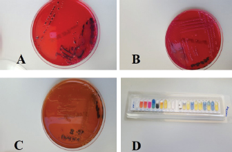 Fig. 3. Cultures of isolated salmonella from the red urine. (A) H2S production reaction on XLD medium; (B) non-lactose fermentation growth on MAC agar medium; (C) chromogenic reduction reaction (red to green) on brilliant green agar medium; and (D) API biochemical identification reaction. Molecular resultsA consensus sequence of 905 bp was generated for both samples. The blast search revealed a 100% identity coverage match of both sequences to the reference sequence of Salmonella enterica subsp. enterica serovar Typhimurium strain LT2. Both sequences mapped to the genome at regions 3571087–3571991 (Figs. 4 and 5). DiscussionDespite a global growth in husbandry, camel diseases remain relatively poorly characterized. Animal salmonellosis is one of the most important diseases of public health globally, due to the pathogen’s potential to infect humans. In this study, the isolation of Salmonella enterica subsp. enterica serovar Typhimurium from febrile camels with hematuria is remarkable because previous studies indicated that camel urine has inhibitory effects against some bacteria (Shoeib and Ba-hatheq, 2007; Humaid, 2016). However, our results corroborated findings by Allerberger et al. (1992) who found nontyphoidal Salmonella spp. as a causative agent of urinary tract infection in human. Despite reports of theileriosis in camels elsewhere, to date, no clinical cases of the disease have been reported in UAE. However, T. annulata antigen was detected in the tick vector; H. dromedarii in Al Ain, in the eastern region of Abu Dhabi. Previous studies stated that fever, anorexia, swelling of superficial lymph nodes, rapid loss of body weight, lacrimation, abortion, infertility, intermittent diarrhea, and nervous signs were common clinical signs of the disease in camels, as well in other hosts (El-Fayoumy et al., 2005; Hamed et al., 2011; Ismael et al., 2014; El-Naga and Barghash, 2016). A pathological profile marked by lymphopenia, anemia, hypoproteinemia, increased GGT, AST, ALT, Total bilirubin, blood urea nitrogen, LDH, and cytokines IL-4 and IL-10 blood levels were also found (El-Fayoumy et al., 2005; Hamed et al., 2011; Ismael et al., 2014). According to the pathogenesis of theileriosis, no symptoms of hematuria or hemoglobinuria have been observed in any susceptible animal host (Hamed et al., 2011; Hekmatimoghaddam et al., 2012). In contrast to these findings, we noticed a completely homogenized hematuria in two dromedary camels infected with Theileria piroplasms, as determined by microscope observation. Pathologically, the Theileria parasite is known to induce immunosuppression due to lymphoid tissue depletion which may encourage the propagation of opportunistic bacterial growth as a secondary consequence (Morrison, 2015). However, exclusive invasion of the urinary tract by Salmonella enterica subsp. enterica serovar Typhimurium out of the huge number of potential opportunistic bacteria within a camel is a notable finding. The hematological parameters, which indicated severe macrocytic hypochromic anemia reported in this study, were likely the result of severe blood loss, followed by an accelerated response of erythropoiesis. Pathogenesis of lymphopenia and eosinophilia recorded in this study were indicative of lymphadenopathies induced by the Theileria parasite which initially proliferates in the lymphoid tissue resulting in lymphocytopenia (Morrison, 2015; 2018). On the other hand, neutrophilia could be the result of the isolation of salmonella from this case. Finally, the association of hematuria with Salmonella and Theileria coinfection in this study is reported for the first time and further pathological investigations in the field of camel diseases are recommended. Animals in nature are commonly co-infected by two or more different pathogens or strains which may act independently or interact with one another and with the host through various mechanisms. Despite the limited number of studies, it has been hypothesized that parasites, including Schistosoma spp., Plasmodium spp., and helminthes lead to various changes in organs that increase the susceptibility of animals to salmonella infections (Sümer et al., 2014; Hsiao et al., 2016; Reynolds et al., 2017). This may also be true in dual Theileria and Salmonella enterica infection in camels, particularly its impact on diagnosis, treatment, and prevention. Highlights