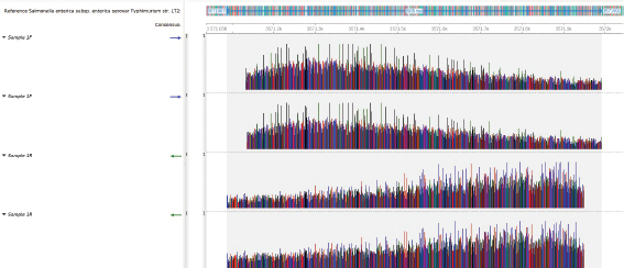 Fig. 4. Mapping of the sample 1 sequence reads to the reference genome of Salmonella enterica subsp. enterica serovar Typhimurium str. LT2. All four sequence reads mapped with 100% identity, spanning a total length of 905 bp between positions 3571087 and 3571991.