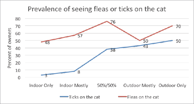 Fig. 1. Owners indicated that a high percentage of their cats had observable flea or tick infestation, regardless of whether they were in an indoor or outdoor environment. Ticks were less prevalent, with higher rates of infestation occurring as outdoor access increased. Survey was conducted from November, 2019 to February, 2020. Survey resultsCat-owner satisfaction proportions with fluralaner for flea and tick control are presented in Table 4. Almost all cat owners (97%) were satisfied or very satisfied with fluralaner. This high satisfaction proportion was consistent regardless of respondent gender or indoor–outdoor status of the cats. Owners aged 46–55 years (p=0.03) and owner preference for fluralaner ( p=0.0007) were predictors of satisfaction. Cat owners were asked whether there were benefits associated with using fluralaner for flea and tick control (question 2). Respondents could select one or more choices or draft their own write-in response. Up to 12-week redosing was the most selected benefit for 76% of all cat owners. Of the six most selected benefits, four were related to convenience (extended duration redosing, less stress for the owner, less stress for the cat, and ease of use), one to product efficacy (one-dose efficacy), and one to adherence to the veterinarian’s recommendation. Response data were sorted by indoor–outdoor status of the cat and whether the owner observed fleas on the cat or environment at any time. The extended redosing interval was the most frequently selected benefit for all indoor–outdoor cat categories and was most frequently selected by owners who had observed fleas on their cats (80%) or whose cat lived primarily in an indoors environment (82%). Cat owners were asked to identify the single most important benefit to them of using an extended duration flea and tick medication and included a write-in response (question 3). The top three responses (Table 4) include extended duration redosing interval as most frequently selected (36%), followed by “eliminate fleas and ticks with one dose” (24%) and “recommended by my veterinarian” (15%). Cat owners were asked to select, from a list of nine choices including a write-in response, different outcomes they may have experienced following the use of fluralaner (question 4) and compare this with their experience with monthly flea and tick products. “Less frequent flea and tick treatment” was the most popular choice, followed by efficacy (“fewer fleas”), and the “12-week redosing interval being easier to remember than monthly redosing”. “Less frequent treatment” was most frequently observed (41%) by a wide margin among female respondents, suggesting that convenience was a key attraction for these cat owners. Cat owners who used fluralaner were asked to indicate the likelihood of their adherence to the recommended redosing interval (question 5). All cat owners were currently prescribed fluralaner at the time of the study. Nearly 9 out of 10 respondents indicated that they readministered fluralaner mostly on time or delayed by a few days. Cat owners were asked to compare their experience using fluralaner with their experience using other flea and tick products for cats (questions 4, 6–11). Cat owners with prior experience using monthly flea and tick products were asked whether they would revert to a monthly medication after using fluralaner (question 6). Only 7% would return to a monthly product, while 71% would not go back to monthly dosing. Owners were asked whether they were more likely to give repeat doses of fluralaner on time compared to a monthly flea and tick product (question 7). Nearly two-thirds of the respondents (62%) were more likely to give a repeat dose of fluralaner on time compared with monthly products, while 33% said the likelihood of on-time dosing would be about the same for both types of medication. Cat owners were asked whether fluralaner provided equivalent yearly durations of flea and tick treatment coverage compared to other flea and tick products (question 8). About one-third (37%) of the respondents indicated that fluralaner would provide more months of treatment coverage, while a similar proportion said that fluralaner would provide the same (37%) or fewer (26%) months of coverage. Cat owners were asked whether it was more convenient and easier, respectively, to readminister fluralaner compared to monthly flea and tick products (questions 9 and 10). Most respondents (86%) found that fluralaner was more convenient to redose, and 78% said it was easier to redose with fluralaner. Female respondents were somewhat more likely than males to report that fluralaner was more convenient (88% vs. 78%) and easier (79% vs. 72%) to administer. Cat owners were asked whether they preferred fluralaner compared with other flea and tick products they have used (question 11). Nearly 9 out of 10 (87%) respondents indicated they preferred fluralaner, with female and male owners having equivalent positive response rates. Statistically significant predictors of preference for fluralaner included product satisfaction ( p=0.0007) and owner observance of fleas on the cat ( p=0.0002). DiscussionThis survey of cat-owner preference, satisfaction, and adherence related to flea and tick treatment with fluralaner found that cat owners have a high level of satisfaction with fluralaner treatment; prefer long-acting treatment over monthly treatment; and select convenience and ease of administration as their principal reasons for these results. These results are important because of the poor compliance with flea and tick treatment generally reported for cats. The introduction of a longer duration flea and tick treatment creates an opportunity for veterinarians to improve cat-owner adherence in this important health management area. These results are consistent with previously reported dog-owner survey results (Lavan et al., 2017a, 2020). Dog owners in the US and several international mar