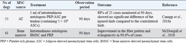 Intralesional injection of MSCs for the treatment of semitendinosus myopathy in dogs has proved to be effective in preventing the formation of fibrous tissue through the regenerative capacity they possess, demonstrated by clinical improvement and ultrasound control. Supraspinatus tendinopathy (ST)Tendon injuries represent a clinical challenge, as their natural healing process is slow, inefficient, and poorly responsive to treatments. The tendon has an inherently limited healing capacity, as it is a slightly cellular and poorly vascularized tissue (Schneider et al., 2018; Torres-Torrillas et al., 2019; Steinmann et al., 2020). A fibrous scar is formed after a traumatic event, producing significant dysfunction and joint movement inability, making it more susceptible to re-rupture (Schneider et al., 2018; Torres-Torrillas et al., 2019). ST is a common cause of forelimb lameness in dogs, especially those with sports functions. This condition is usually associated with excessive effort and repetitive movements that do not allow adequate tissue remodeling (Canapp et al., 2016a). Inflammation may play a vital role in triggering ST. However, it does not appear to be involved in the disease’s progression (Lafuente et al., 2009; Canapp et al., 2016a). Histologically speaking, ST shows minimal inflammation, hypocellularity, loss of collagen, increase of proteoglycan content, and lack of neovascularization. The damaged tendon shows discontinuous and disorganized tendon fibers, and occasional mineralization. In chronic cases, calcification may also occur at the site of insertion (Lafuente et al., 2009; Canapp et al., 2016a). Conservative therapy includes the use of non-steroidal anti-inflammatory drugs (NSAIDs), rest, rehabilitation therapy program with massages and hot therapy, acupuncture, ultrasound or laser therapy, and also focal shockwave therapy (Lafuente et al., 2009; Canapp et al., 2016a). Additionally, surgical management involves extracting the calcified biological material or even releasing the tendon at its origin (Lafuente et al., 2009; Canapp et al., 2016a). Despite these options, the percentage of therapeutic success, according to previous studies, is relatively low (Laitinen and Flo, 2000; Canapp et al., 2016a). Therapy with MSCs has been showing great results for ST in canine patients due to the secretion of cytokines and growth factors that reduce inflammation, inhibit programmed cell death in the cells inside the tissue, and recruit circulating stem cells to the affected area. Moreover, it increases the density of collagen fibers, improves tissue architecture, restores an almost standard tendon–bone interface, and improves biochemical strength (Canapp et al., 2016a). Two different studies, one with BMSC and the other with ASC, have been published to treat canine ST. The first study (Table 2) involved 55 dogs with ST that did not respond to conservative management with NSAIDs (61.8% with no response) and a rehabilitation program (45.5% refractory to rehabilitation). ASCs were obtained from the falciform ligament of each patient and blood samples for autologous PRP therapy. Every patient received 1 ml of PRP/ASC per tendon (containing 5 × 106 ASCs). After ultrasound-guided injection of PRP/ASC, objective gait analysis was available in 25 out of the 55 dogs at 90 days after treatment. On the 90th day, 88% of these 25 available cases showed no significant difference in the total pressure index percentage of the injured limb compared to the contralateral limb (Canapp et al., 2016a). The second study (Table 2) involved 41 dogs with ST treated with a combination of autologous BMSC and PRP, evaluating the ultrasound evolution with treatment. This study has proved a significant reduction in the cross-sectional area of the affected tendon. On the 45th day post-treatment, the comparison of the treated limb with the contralateral limb showed substantial improvements. On the 90th day post-treatment, in 90.6% of cases, the fiber pattern and echogenicity improved considerably. Furthermore, in 13.8% of the patients, the fiber pattern and echogenicity abnormalities were considered resolved (Mcdougall et al., 2018). Intratendinous injection of MSCs in addition to PRP therapy for ST treatment in canine patients has demonstrated auspicious clinical benefits (Tornero-Esteban et al., 2015; Canapp et al., 2016a; Mcdougall et al., 2018). This approach represents a minimally invasive treatment option, revealing positive sonographic results. This treatment combination appears to provide an adequate biologic effect, leading to tendon healing and improved function (Mcdougall et al., 2018). Table 2. Preclinical trials carried out with MSCs in canine ST.
