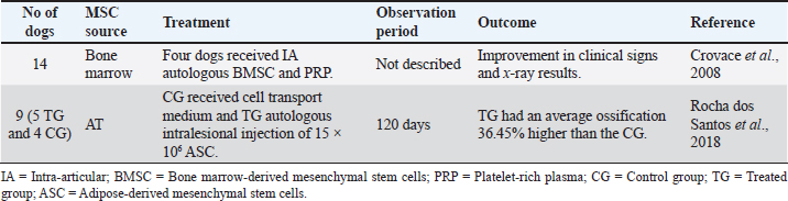 Regarding MSCs source, the most commonly used in veterinary medicine are AT and BM. None of these studies has demonstrated the superiority of one cell source over another. However, stem cells derived from AT were the most used by the authors, probably due to their easier extraction, namely in elective ovariohysterectomy. MSCs therapy can be autologous/allogeneic or xenogeneic depending on whether stem cells are obtained, respectively, from the same animal, same species donor or from different species. Two studies regarding canine OA treatment have used xenogeneic MSCs from porcine or horses, reporting excellent results with no severe adverse effects in none of the dogs (Tsai et al., 2014; Daems et al., 2019). Regarding the routes of administration, the one that is preferentially selected is the injection of MSCs directly at the injury site. Experimental studies support the greater effectiveness of the intralesional route of administration when comparing to others. Intra-articular injection of ASCs is the most commonly reported route to deliver cells into the damaged cartilage; however, in most cases, it requires anesthesia or sedation, and synovial fluid from arthritic joints is reported to be cytotoxic to cultured MSCs (Kiefer et al., 2015). Therefore, new protocols with the intravenous route have been developed. The intravenous administration of MSCs promotes a better interaction with the immune system, which may lead to systemic anti-inflammatory effects and reduce pain at multiple sites. However, despite the attraction of MSCs to the injured areas by the intravenous route, its effectiveness was reported to be low in some studies (Eggenhofer et al., 2014; De Becker and Van Riet, 2016). Shah et al. (2018) compared ASC therapy by different administration routes in dogs with OA. They realized that the intra-articular way had better improvements than the intravenous one. Olsen et al. (2019) studied the effect of ASCs by intravenous route in dogs with OA. Despite the improvement in clinical outcome, subjective outcome measures (such as OA biomarkers in synovial fluid) did not confirm similar progress. These results reveal the need for larger samples sizes and CGs to interpret the outcomes and more research before intravenous MSCs becomes a therapeutic option for dogs with OA. It is necessary to increase our knowledge of the MSC migration process to improve it. According to previous studies, it has been reported that treatment with ASC or BMSC in combination with PRP or PRGF improves clinical signs, reducing lameness and providing notable recovery of previous limited sports activities (Cuervo et al., 2014). The effect of PRP is due to the behavior of the platelet concentrate, acting as a scaffold which, through the release of growth factors (such as TGF-β, fibroblast growth factor and IGF-1), promotes the stimulation of chondrogenesis, increases hyaluronic acid production, promotes angiogenesis, and differentiation of the existing cells in the treated area (Cuervo et al., 2014; Upchurch et al., 2016). The PRGF is considered a better choice by some authors due to the optimal concentration of platelets and absence of white blood cells (Nishiyama et al., 2016). Cuervo et al. (2014) demonstrated that a single IA injection of ASCs is significantly more effective than one IA injection of PRGF. Therapy with PRGF alone showed similar improvements as ASC in the first month post-treatment. However, better results were observed in the long term in patients with ASCs. Other studies had great results in the combination therapy: MSCs with PRP or PRGF (Cuervo et al., 2014; Canapp et al., 2016c; Mcdougall et al., 2018). MSCs therapy with specific concomitant medication proved detrimental to treatment, particularly with NSAIDs, generally used for these conditions. Shah et al. (2018) studied allogeneic ASC therapy in dogs with OA, reporting only one case that did not respond to the treatment and had shown worsening of the condition. This dog was the only one receiving NSAIDs therapy at the same time as MSCs therapy. Most studies did not include immunohistochemistry, immunofluorescence, and histopathology to confirm that MSCs have differentiated and/or incorporated into the injured tissues. Further studies will be needed to definitely prove stem cell differentiation and engraftment. However, their initial cell-to-cell contact and cytokine release effect seems to be the most significant therapeutic impact of these cells. ConclusionMSCs have been shown to have an excellent potential for orthopedic therapy in dogs, especially for OA, where all studies presented promising results. This therapy has shown no evident adverse effects, even with its allogeneic administration, making them a safe and promising therapeutic option. The main obstacles to this therapy are the inconsistency of protocols applied to date, the small samples used for clinical trials, patient variability, and the follow-up time of cases after therapy. Besides, it should be noted that cell therapies in veterinary patients are not strictly supervised by regulatory agencies in most countries. There is an urgent need for health agencies, national and across borders, such as European Medicines Agency (EMA), to define and regulate the standardization and criteria for the safe and efficient application of these therapeutic approaches. Future trials should have more homogeneous and larger samples, predefined standardized stem cell protocols for treatment groups, presence of CGs, and continue data collection for more extended periods (more than 6 months) for appropriate long-term conclusions. Currently, therapy based on MSCs requires, more than ever before, a thorough analysis and consideration in the hope of overcoming its limitation in upcoming trials. AcknowledgmentsThis research was funded by National Funds by FCT (Portuguese Foundation for Science and Technology) under the project UIDB/AGR/04033/2020. Conflict of interestP.P.C. declares to be the fo