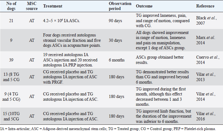 Table 6. Preclinical trials carried out with MSCs in canine stifle OA.