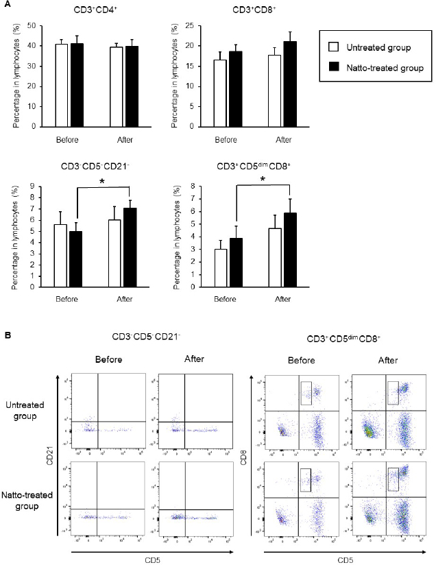 AbstractBackground: Probiotics are known for their ability to enhance cellular immunity, including the activation of macrophages, natural killer (NK) cells, and cytotoxic T lymphocytes. Natto is a Japanese traditional probiotic food made by fermenting soybean with bacteria Bacillus subtilis var. natto. Components of natto include spores of B. subtilis natto, poly-γ-glutamic acid, and levan, which have demonstrated their immunoadjuvant and anti-allergic effects through various in vitro and in vivo studies. However, it remains unclear whether oral administration of natto can modulate the immune activity in animals. Aim: This study aimed to investigate the effects of oral administration of natto on the immune system of dogs. Methods: Eight dogs were randomly divided into two groups: a natto-treated group and an untreated group. The dogs in the natto-treated group were fed with 10 g/head/day of a freeze-dried natto product in addition to a usual amount of regular dry food for 14 days, whereas the dogs in the untreated group were fed with the regular dry food alone. To determine cellular immune activity, the cell surface antigen analysis of peripheral blood lymphocytes and cytotoxicity analysis of peripheral blood mononuclear cells were carried out before and after the natto administration period. Additionally, a relative expression of inflammatory cytokines in peripheral blood monocytes after the introduction of antigen-stimulation was also examined. Results: At the end of the administration period, a proportion of NK cells (CD3− CD5− CD21− cells and CD3+ CD5dim CD8+ cells) in peripheral blood lymphocytes were found to be significantly increased, and the cytotoxic effect of the peripheral blood mononuclear cells on canine tumor cells were greatly enhanced in the natto-treated group, but not in the untreated group. The expression of TNF-α in peripheral blood mononuclear cells following an antigen-stimulation was increased considerably in the dogs after administration of natto. Conclusion: We conclude that oral administration of natto activated the cytotoxic activity of peripheral NK cells in dogs, and a daily intake of natto might be helpful in augmenting cellular immune activity. Keywords: Bacillus subtilis natto, Cellular immune, Dog, Fermented soy bean, Natural killer cell. IntroductionProbiotics, or foods that contain them, constitute live microorganisms with beneficial effects on human and animal health. Recently, various probiotic products have been developed, and their preventive or therapeutic effects on multiple diseases have been reported (Dang et al., 2020). Probiotic products have been proven to be effective in enhancing the cellular immune responses characterized by the activation of macrophages, natural killer (NK) cells, and antigen-specific cytotoxic T lymphocytes (Ashraf and Shah, 2014). Research on the immunomodulatory effects of probiotics involves extensive studies on Bifidobacterium lactis (HN019), a probiotic organism. It has been reported that the organism can increase the number and enhance the activity of T lymphocytes, polymorphonuclear cells, and NK cells in the human peripheral blood. Natto is a traditional Japanese probiotic food made by fermenting soybeans with Bacillus subtilis var. natto (Weng et al., 2017). Natto contains functional components such as natto kinase, poly-γ-glutamic acid, and levan, which possess thrombolytic, immunoadjuvant, and anti-allergic activities (Sumi et al., 1987; Xu et al., 2006; Lee et al., 2014). Additionally, natto-containing foods reportedly increase Bifidobacterium species in the intestines of mammals (Fujisawa et al., 2006; Mitsui et al., 2006). In addition, Gong et al. (2018) demonstrated that oral administration of B. subtilis natto spores enhanced cellular immunity in mice. Although these facts suggest that the supplementation of natto may have beneficial effects on canine health, especially cellular immunity, the effect of oral administration of natto is unknown in dogs. Recently, multicolor flow cytometry has been used for the analysis of canine lymphocyte subsets. Similar to those in humans, specific cell surface molecules such as CD4 (for helper T cells) and CD8 (for cytotoxic T cells) are widely accepted as biomarkers in dogs (Friedenberg et al., 2018; Withers et al., 2018). NK cells are non-T, non-B lymphocytes that play a pivotal role in the innate immune system (Michael et al., 2013). NK cells can kill cancer cells and virus-infected cells without prior activation through direct cytolytic activity and via the production of cytokines (Shin et al., 2013; Lee et al., 2018). Although the expression of specific surface molecules on human cells (CD56 and CD16) and murine cells (NK 1.1 and NKp 46) allow the identification of NK cells, these molecules have reportedly been unfavorable for the identification of canine NK cells (Otani et al., 2002; Hammond et al., 2009). In humans, CD3− CD5− CD21− and CD3+ CD5dim CD8+ cells are referred to as non-T, non-B cells, and NK cells, respectively. However, these cells have been identified as NK cells in dogs (Huang et al., 2008; Michael et al., 2013). A difference in the functional activity of CD3− CD5− CD21− and CD3+ CD5dim CD8+ cells was reportedly due to their degree of maturation (Lee et al., 2018). Hence, a change in the population of these cell types may be used to indicate cellular immune activity. In the present study, we examined whether oral administration of natto could activate or suppress the canine immune system. The results of this study could encourage the use of oral administration of natto for adjunctive therapy in dogs with some diseases, such as infectious diseases, neoplastic diseases, and autoimmune diseases. Materials and MethodsSelection of dogsA total of eight healthy dogs (six miniature poodles and two mixed-breed) were selected from the training course at the Okayama University of Science Specialized Training College for this study. Their 