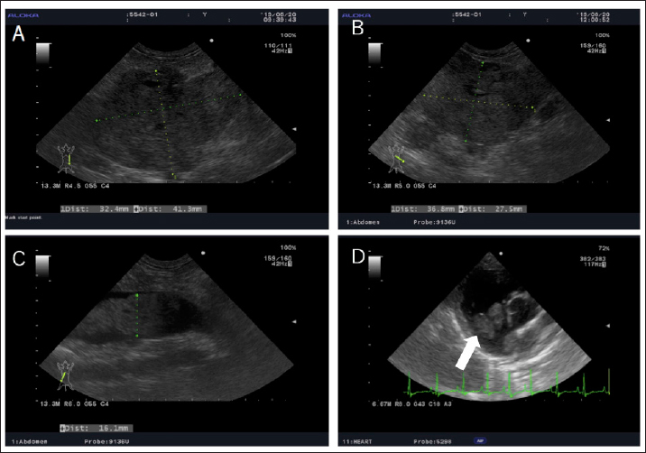 Fig. 2. Echography images of the abdominal and cardiac regions. (A) An intra-abdominal tumor with continuously mixed echogenicity is found in the left adrenal gland, occupying most of the abdominal cavity on day 1. (B and C) At day 63, the size of the tumor mass, particularly, the size of the tumor plug in the posterior vena cava, is clearly reduced. (D) Wart-like structures (shown by an arrow) are also found in the right atrium on day 203. A necropsy was performed at the Laboratory of Veterinary Pathology, Yamaguchi University. A gross examination of the abdominal cavity revealed that a peritoneal tumor originated in proximity to the left kidney and was considered an adrenal origin. And the tumor had invaded the dorsal-ventral wall of the left lumbar region. It adheres to the subcutaneous muscle layer, but does not invade the muscle layer (Fig. 3A). The tumor had proliferated in the vascular lumen between the renal vein and the posterior vena cava, and extended to the right atrium (Fig. 3B). The wart-like structures in the right atrium observed by echography were considered as tumor tissues macroscopically. In addition, the dog’s face was deformed because of the presence of a tumor occupying the nasal cavities and extending from the oral cavity. The tumor dominated the space from the hard palate to the nasal cavities and infiltrated the nasal cavities, pharyngeal cavities, and retrobulbar space. The pituitary gland and right adrenal gland were normal macroscopically. However, in the cut surface of the right adrenal gland, there was one white nodule with a diameter of about 5 mm, which was considered to be a cortical hyperplasia lesion. Histological examination revealed the abdominal mass comprised polyhedral to spindle cells forming a nest and pseudorosette (Fig. 4A and B). Although immunohistochemical staining was performed using rabbit anti-human chromogranin A (poly, ready to use; Nichirei Bioscience, Tokyo, Japan), mouse anti-human melan A (clone A103, 1:200; Dako, Carpinteria, CA), and rabbit anti-ACTH (ready to use; Zymed Laboratories, San Francisco, CA) only chromogranin A returned a positive result (Fig. 4C and D). Therefore, the intraperitoneal tumor was diagnosed as a pheochromocytoma. In addition to the vena cava and abdominal wall, micrometastatic foci were found in the liver. No histological abnormality was found in the brain and pituitary gland. The right adrenal gland, in the macroscopically observed white nodule, chromogranin-A-positive medulla-derived tumor cells, similar to those in the left adrenal gland, proliferate while compressing the cortex. The nasal tumor was diagnosed as chondrosarcoma, and negative for chromogranin A. The tricuspid valve becomes moderately thickened with mucoid generation, but the myocardium was unchanged.