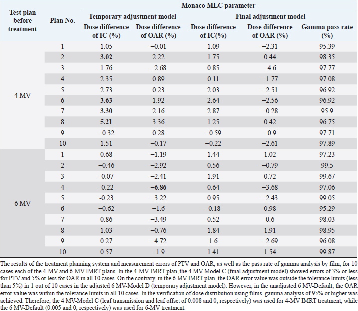 Table 2. Results of the treatment planning system and measurement errors of PTV and OAR, as well as the pass rate of gamma analysis by film for 10 cases each of the 4-MV and 6-MV IMRT plans.