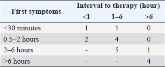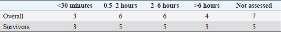 Table 3. Interval from first clinical sign to initiation of therapy in dogs with metaldehyde poisoning.