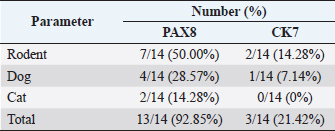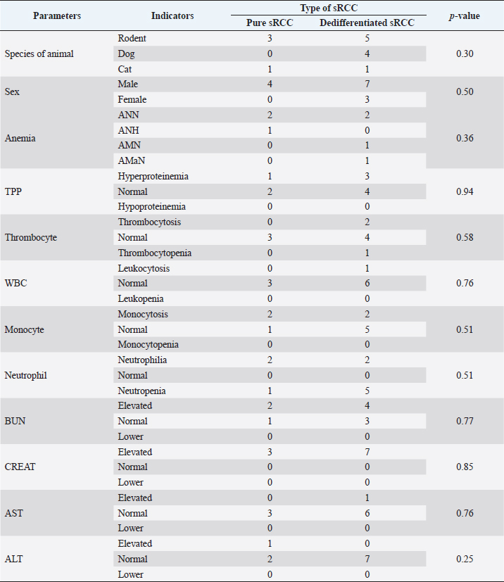 For IHC, the slide was deparaffinized and rehydrated using xylene and alcohol. The slide was retrieved using antigen retrieval solution (RE7113-CE, Leica Biosystem) and applied using the primary antibody against PAX8 (sc-81353, Santa Cruz, CA) and CK7 (sc-23976, Santa Cruz, CA). Further, the slides were processed following a previous study (Prakoso et al., 2020). The slides were retrieved using an antigen retrieval solution at 98°C for 20 minutes. The slides were then incubated using peroxidase block and protein block. After that, they were incubated using a primary antibody (antibody anti-PAX8 and CK7), post-primary antibody, chromogen, and counter-stain. The slides were covered using Entellan and cover slip. The staining result was then analyzed using a light microscope (CX-33 Series, Olympus, Japan). MorphometryThe morphometry of H&E slides was analyzed by a senior pathologist. The mitotic count was measured and standardized using the Fuhrman grading system (Edmondson et al., 2015). The Fuhrman grading system was based on the nuclear and nucleolar morphology with four grades from grades I, II, III, and IV. In contrast, the IHC was analyzed and measured using a simple scoring system. The area that showed the immune expression of PAX8 and CK7 was scored as: 1 (immune-expressed) and 2 (no immune-expressed) (Palgunadi et al., 2019). Analysis dataThe data of hematology were qualitatively analyzed and the interpretation of each hematological parameter was reported as a percentage. The data of histopathology were reported qualitatively and the immunohistochemical score was reported as the percentage. Further, the correlation between each parameter was analyzed using Fisher’s exact test (Kim, 2017). All the statistical analysis was performed using Statistical Package for the Social Sciences version 26 with a p-value=0.05. Ethical approvalThe ethical clearance committee from the Faculty of Dentistry, University of Airlangga, Surabaya has approved this study with registration number: 226/HRECC/FODM/IV/2020. All the samples were collected under the supervision of the veterinary clinician and veterinary pathologist. In addition, the owners’ informed consent was received before the specimens were collected from pets. ResultsClinical characteristics of animalsThe sRCC predominantly occurred in rodents (eight cases), dogs (four cases), and cats (two cases). The rodents that suffered from sRCC were experimental rodents 75% and pet rodents (12.5% of Roborovski dwarf hamsters and 12.5% of Campbell hamsters). The experimental rodents were not showed any clinical signs; however, it was identified after the kidney tissue was diagnosed by the pathologist. In contrast, the pet rodents showed hematuria and anorexia. One of the pet rodents died before the surgery and the other one died after surgery. Unfortunately, there are only minimal data regarding the occurrence of sRCC in either canines or felines. During the past 5 years, there are only four cases of sRCC in dogs and two cases in cats (Table 1). Hematology and serologyBased on the hematological test, various hematology changes are being observed including anemia, thrombocytosis, thrombocytopenia, hyperproteinemia, leukopenia, lymphocytosis, monocytosis, neutrophilia, uremia, hypercreatinemia, elevated AST and ALT (Table 2). Unfortunately, the hematological data were only available in 10 animals (7 rodents and 3 dogs) from a total of 14 animals (Table 1). The detail of the hematological result was shown in Table 2. Table 2. Hematological result of the selected animals.