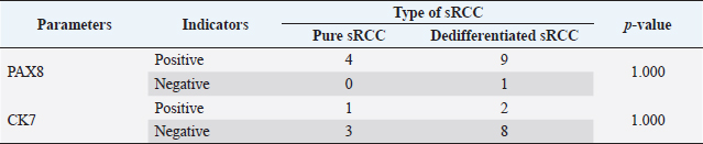 Table 6. Correlation between type of sRCC and the immune expression of PAX8 and CK7.