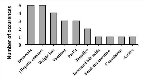 Fig. 2. Main complaints of dogs diagnosed with copper-associated hepatitis between May 2010 and March 2017 in a Veterinary Referral Hospital from Paris region (France). CBC results from 7 dogs were available and all parameters were within the reference range. Although incomplete in several cases, biochemistry profiles were available in 16/17 dogs. Fifteen out of 15 dogs presented with increased ALT (mild, n=2; moderate, n=4; marked=9), 12/12 with increased ALP (mild, n=5; moderate, n=3; marked, n=4), 5/6 with increased GGT (mild, n=2; moderate, n=3) and 1/1 with increased AST (mild, n=1). Total protein was decreased in 7/12 dogs, 5 of which were also hypoalbuminemic. The remaining parameters were unremarkable. Abdominal US was performed in all dogs in this study. Findings included an heterogenous mottled liver (5/17), hepatomegaly (4/17), hypoechoic liver nodules (3/17), microhepatica (3/17), and hepatic lymphadenomegaly (3/17). Other findings included: a distended gallbladder (1/17), intra and extra-hepatic choledocholithiasis (1/17), increased pancreatic size (1/17), thickened gastric wall (2/17), splenomegaly (1/17), intestinal parietal segmented lesions that were suggestive of chronic inflammation (1/17), mild peritoneal effusion (1/17) and mineralization of the adrenal glands (1/17). Four dogs had no observable ultrasonographic alteration of the liver. An angioscan was performed on one dog with elevated biliary acids and a history of seizures but no vascular abnormalities were found. Ten out of the 17 biopsies were performed using a percutaneous approach (14 gauge true-cut needle biopsy), laparoscopy (using cup biopsy forceps) was performed in 6/17 and laparotomy was done in 1/17. The number of samples that were obtained ranged from one to two samples for cases in which true-cut needle biopsy was performed; and from one to five in all other techniques. The quality of samples obtained by percutaneous approach was classified as poor in 5/10, acceptable in 2/10, good in 2/10, and very good in 1/10. Those obtained by laparoscopy were mostly acceptable (poor=2; acceptable=3; good=1), and the surgical sample was estimated very good. The rhodanine staining pattern was centrilobular (zone 3) in 8/17 dogs (Figs. 3 and 4) and periportal (zone 1) in 3/17 dogs. In 6/17 dogs, the pattern was considered as multifocal. The information about the prescribed treatment was available for 11 out of the 17 clinical cases. The most frequent treatment was S-Adenosylmethionine (8/11) followed by a prescription diet (7/11), penicillamine (6/11), and corticosteroids (4/11). Additionally, two dogs received ursodeoxycholic acid and vitamin E, and one dog received azathioprine and maropitant. Of those, only 8/11 returned to the referral center for follow-up. Overall, 4/8 dogs showed a clinical improvement. In the first 2 months of treatment, there was no decrease in liver enzymes in 3/8 dogs and clinical improvement was only observed in one of them. Between 2 and 21 months after the onset of medical treatment, four out of these eight patients demonstrated a decrease in blood liver enzymes. Only one of these dogs submitted to a follow-up liver biopsy, 4 months later, which revealed persistent histological signs of inflammation, albeit less marked. One case underwent a cholecystoduodenostomy due to choledocholithiasis. This procedure reportedly led to clinical improvement and a concurrent decrease in liver-enzymes, which became borderline-normal.