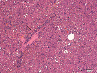 Fig. 3. Histological section of canine liver. Haematoxylineosin stain. Magnification × 100, bar=100,100 μm. Hepatitis with centrolobular zone infiltrated by lymphocytes, plasma cells and a few neutrophils (black arrow). Normal portal space (red arrow).