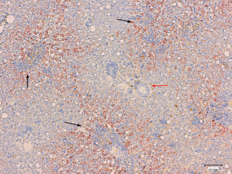 Fig. 4. Histological section of canine liver. Rhodanine stain. Magnification × 100, bar=100 μm. Copper accumulation around the centrolubular spaces (black arrows) with relative sparing of the periportal area (red arrow). DiscussionThe present study assessed the main epidemiological factors, clinical and laboratory findings, liver biopsy technique, and response to treatment in 17 dogs diagnosed with CAH. Concerning breed predisposition, this study is in agreement with previous ones reporting an over representation of Terriers and German Shepherd Dogs. To the author’s knowledge, this is the first study describing CAH in four cases of two breeds not yet reported: American Staffordshire Terriers and Beaucerons. As the majority of the reported cases are from the United Kingdom, Netherlands, or United States, this study shows a different trend in affected breeds (Bexfield et al., 2012; Roelen, 2013; Webster et al., 2019). American Staffordshire Terrier is somewhat expected as the disease is well described in Terrier’s group. Beauceron is a french breed of the pastoral group, relatively common in France. Originating from the region of Beauce (France), it is one of the native breeds of the country, with the highest population size (Leroy et al., 2006). Similarly to German Shepherd Dogs, Beauceron takes part of the Sheepdogs and Cattledogs, according to the World Canine Organization (Féderation Cynologique Internationale). Although to author’s knowledge, there is no truly relationship inbetween these breeds, they have common phenotypic and behavioral findings, suggesting a possible common genetic basis for CAH predisposition. Despite the low number of identified cases, this study raises the concern of a potential new-breed predisposition emphasizing the need of a medical exploration in case of increased liver-enzymes. Overall, this study not only reinforces the overexpression of CAH in Terriers but also increases the spectrum of documented breeds affected with CAH. Although gender predisposition was not statistically relevant, the fact that CAH were more frequently identified in females and the median age of 8 years are in agreement with previous studies (Hoffmann, 2009; Dirksen, 2016). Clinical signs were non-specific, with five cases only demonstrating increased liver enzymes, reflecting the silent progression of CAH and capacity of the liver to withstand large amounts of oxidative stress. Regarding clinicopathologic data, all patients demonstrated an increase in one or more liver enzymes. In particular, patients tended to experience a marked increase in ALT, thus substantiating the presence of parenchymal disease. Two-thirds of affected dogs demonstrated hepatic changes on abdominal US. However, these changes were not specific. In agreement with previous studies, these results support that biochemical analysis are the most pertinent first line complementary exam to assess hepatic parenchymal disease (Webster et al., 2019). In contrast, ultrasonography can be useful to assess the nature of those lesions as well as the need for more invasive diagnostic procedures, such as liver biopsies. In these animals, different ultrasonography findings were observed and only in four dogs this exam was unremarkable. Nonetheless, ultrasonography is a valuable complementary exam in the majority of dogs, reinforcing the need of liver sampling. In fact, histopathology of liver tissue remains the most concise method to confirm the accumulation of copper and presence of hepatitis (WSAVA (Liver Standardization Group), 2006; Webster et al., 2019). The percutaneous needle biopsy was the most used technique in this study, followed by cup wedge biopsy through laparoscopy. Previous studies have shown that the first one should not be the main choice due to the suboptimal sized samples that it provides and consequent friability, resulting in low-quality biopsies (Cole et al., 2002). The information gathered from the histopathological reports conducted in this study matched these observations since 50% of biopsies performed with a percutaneous needle were classified as poor, as opposed to 20% for laparoscopic wedge biopsy and none for the surgical approach. However, it has recently been demonstrated that needle samples, cup samples and punch liver samples tend to provide similar histopathologic diagnoses since they both deliver a sufficient number of portal triads, and that more important than the technique used is the number of samples collected (Kemp et al., 2015). In general, techniques providing larger biopsies should be favoured and when not feasible, the collection of multiple samples should be made. Based on this study, results, and on the recent literature, it is then reasonable to assume that when a biopsy is taken, the clinician should consider the technique providing larger biopsies and, when it is not feasible, multiple samples should be done. Overall, it seems more pratical to consider surgical or laparoscopy approach in order to increase the chances of acquiring good samples and a reasonable ammount of tissue for a more reliable histological diagnosis. Copper accumulation was confirmed in all clinical cases through rhodanine staining. The centrilobular stain pattern observed in the majority of dogs emphasizes the primary condition of the disease. This pattern is a recurrent finding in breeds in which the hereditary cause has been confirmed (Hoffmann et al., 2006). Periportal copper accumulation was observed in three dogs. This could be explained by the presence of periportal inflammation, hindering bile flow in this region. All these signs supports cholestasis, meaning that the accumulation of copper in those dogs, was likely to be secondary to the obstruction of bile flow. Finally, the multifocal copper accumulation was usually attributed by the pathologists to the overall low quality of the samples provided (small size, friability) and to a lesser degree to the marked structural modifications due to