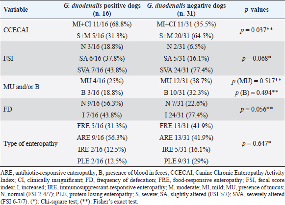 Due to the small amount of fecal material available, PCR was performed only on 9/16 dog samples found positive for G. duodenalis at parasitological examination, while only for 6/9 positive dogs it was possible to identify also G. duodenalis assemblage. G. duodenalis assemblage D was identified in five of them and assemblage C in only one. From the evaluation of possible differences between G. duodenalis positive and G. duodenalis negative dogs according to the FSI, a higher frequency of fecal consistency alteration was observed in the G. duodenalis negative dog group, although no significant differences emerged at statistical analysis (Table 1). Indeed, fecal consistency was greatly reduced (FSI 6 or 7) in the 77.4% (24/31) of G. duodenalis negative dogs and in the 44% (7/16) of the G. duodenalis positive dogs. However, significant differences (p=0.037) emerged at statistical analysis between G. duodenalis positive and G. duodenalis negative dogs according to the CCECAI index, since most of Giardia-negative dogs had a moderate/severe CCECAI score (20/31, 64.5%), while among Giardia-positive dogs the same index was mainly low/negligible (11/16, 68.8%) (Table 1). No statistical difference was instead found between the two groups of dogs according to the types of enteropathies (PLE, FRE, ARE, and IRE) (Table 1) although a higher frequency of PLE was observed among G. duodenalis negative dogs (9/31, 29%) in respect to that observed among G. duodenalis positive dogs (2/16, 12.5%). DiscussionTo date, this is the first study evaluating G. duodenalis in a selected population of dogs with a diagnosis of primary CE. Our findings are taken from a population which underwent on a fenbenzadole treatment prior the inclusion. The prevalence of G. duodenalis in primary CE found in the present study (34%) is much higher than data reported in recent studies in symptomatic dogs in Europe (Epe et al., 2010; Volkmann et al., 2017). Furthermore, it is higher than prevalence of G. duodenalis found in different dog populations in Italy (Pipia et al., 2014; Zanzani et al., 2014; Paoletti et al., 2015; De Liberato et al., 2018), including privately owned (about 4%) and kennel (about 5%) dogs of the same area (Riggio et al., 2013; Sauda et al., 2018). In our opinion, this high prevalence which we found it is unlikely to be associated to a primary G. duodenalis infection. Although the reported efficacy of fenbenzadole treatment is very high (Barr et al., 1994; 0 et al., 1998), a fenbendazole resistance may occur in dogs. Another possible explanation is that the risk of G. duodenalis infection seems to increase with high frequency of anthelmintic treatment. This may be due to the change of the intestinal niche caused by the anthelmintic therapy on major parasites (Bugg et al., 1999). However, it is not possible to exclude that the positive dogs may be newly infected due to incomplete animal and/or environmental disinfection (Raza et al., 2018). Finally, in our opinion, this result may be related to the dog population here considered because the intestinal alterations caused by chronic inflammation may predispose CE- affected dogs to the acquisition of G. duodenalis infections. However, it is unlikely that G. duodenalis may have a significant role in the gastrointestinal signs in our dogs. Indeed, from the evaluation and scoring of clinical parameters, the presence of G. duodenalis was not associated with more severe clinical forms. On the contrary, the CCECAI score was indicative of significantly more severe clinical forms in G. duodenalis negative group. In addition, FSI and the presence of mucus or blood in stools were not statistically associated with G. duodenalis infection. No significant differences emerged also between G. duodenalis-positive and G. duodenalis-negative dogs according to the type of enteropathies (e.g., ARE, FRE, IRE, and PLE). Giardia duodenalis infections can be asymptomatic, subclinical, and clinically evident forms may occur especially when other factors are also present, such as concurrent entero-pathogenic bacteria or parasites, food intolerance or decreased host defense ability and stress conditions (Ballweber et al., 2010; Tysnes et al., 2014). Interestingly, all clinical parameters used in this study to score the severity of signs were indicative of less severe clinical forms in the group of G. duodenalis-infected dogs, especially the CCECAI score that gave statistically significant results. To the best of our knowledge, no previous studies specifically investigated the prevalence of G. duodenalis in canine primary CE; its possible associations with the type of enteropathy and the severity of clinical presentation. In fact, only the stool consistence and the presence of diarrhea were previously evaluated in dogs infected by G. duodenalis (Epe et al., 2010; Upjohn et al., 2010; Pipia et al., 2014; Volkmann et al., 2017). However, it is also possible that some dogs considered negative in this study were instead positive, since only a single fecal sample per dog was examined. In fact, due to the inconstant shedding of the cysts into the feces, for the detection of G. duodenalis it is advisable to examine three samples collected in three non-consecutive days, while the examination of a single fecal sample has a lower sensitivity (Tangtrongsup and Scorza, 2010). In this study, only the canine assemblages C and D were identified at genotyping of some dog fecal samples found positive for G. duodenalis at molecular analysis. These data seem to confirm the higher frequency of these canine-specific assemblages in privately owned dogs in Italy (Pipia et al., 2014; Paoletti et al., 2015; Simonato et al., 2017; Sauda et al., 2018). Nevertheless, it is not possible to exclude the presence of the zoonotic assemblages A and B in the remaining positive dog samples for which molecular analysis and genotyping were not possible. Indeed, the assemblages A and B have been also identified in owned dogs from I