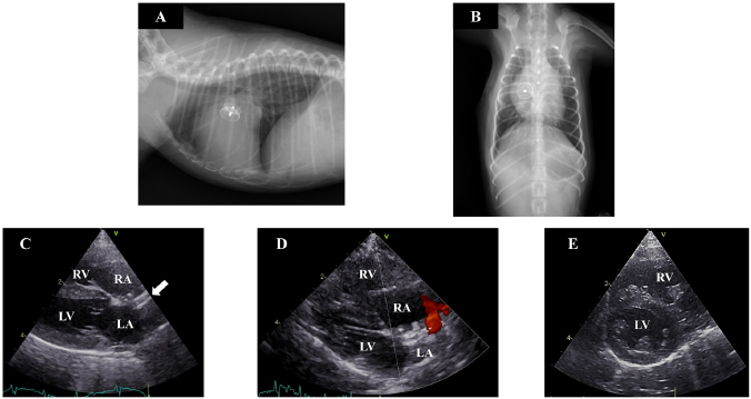 Fig. 2. Thoracic radiography and echocardiography 7 months after the operation. (a) and (b): In thoracic radiography, the device was clearly visible and there was no evidence of pulmonary overcirculation. (c)–(e): The device was appropriately positioned across the defect (solid arrow), and the right atrial and ventricular volume overload had almost resolved although mild residual shunting was observed. Ventricular septal flattening was also improved. (LA): left atrium; (LV): left ventricle; (RA): right atrium. The method utilized in the current case was problematic in one respect. The device was seen to go through the defect on the first occasion, and the main reason for this was underestimation of the ASD. Transthoracic and transatrial echocardiography was used to assess the size of the ASD. To determine a defect’s size, the use of a balloon catheter is recommended (Gordon et al. 2009). This was not done in the present case due to the possibility of perforation or right atrial rupture associated with the use of a balloon catheter. In many cases, ASDs are elliptical (Zanchetta et al., 2003), and this can lead to underestimation of the size of the defect. In humans, ASD cardiac magnetic resonance imaging, cardiac computed tomography angiography, or 3D echocardiography are recommended to assess defects (Brown and Kanmanthareddy, 2019; Taniguchi et al., 2009; van den Bosch et al., 2006). Although, in midget breed dogs, as in the present case, the width of the atrial septum may be too thin for these methods, such methods may also be necessary to assess defect size. The Japanese Circulation Society recommends that, in humans, any uncomplicated ASD with Qp/Qs ≥ 1.5, defects ≥ 5 mm and < 38 mm, or RV enlargement has been closed. It has also been reported that large dog breeds with defects > 12 mm may develop clinical signs (Gordon et al., 2009). However, no recommendations pertaining to small and midget dog breeds have been reported. This may be because the prevalence of ASD is reportedly higher in larger dog breeds including standard poodles and boxers (Chetboul et al., 2006; Guglielmini et al., 2002), and it is difficult to diagnose ASD since cardiac murmur is not always present (Chetboul et al., 2006). In the present case, ASD closure was performed because Qp/Qs ≥ 1.5 and RV enlargement were evident. In the present case, an Amplatz canine duct occluder was used to close the ASD. Currently, the Amplatz septal occluder (ASO) is used for ASD closure in humans, and its use has also been reported in veterinary medicine (Gordon et al., 2009; 2010). However, in Japan, the ASO is not approved for use in veterinary medicine. Due to this, an Amplatz canine duct occluder was used, and the closure was successful. This is the first report about the ASD closure in a midget breed dog. Further research involving a large sample size is warranted to evaluate the risks associated with the use of a hybrid approach for ASD closure in midget dogs. Conflict of interestThe authors declare that there is no conflict of interest. Author’s contributionsConceptualization: Keisuke Sugimoto, Yohei Mochizuki, Masaki Kochi, and Takuma Aoki. Data curation: Keisuke Sugimoto. Formal analysis: Keisuke Sugimoto and Yohei Mochizuki. Investisgation: Keisuke Sugimoto, Yohei Mochizuki, Teppei Kanda, Akihiro Ohnishi, Masahiro Miyabe, and Yuko Wada. Methodology: Keisuke Sugimoto, Yohei Mochizuki, Teppei Kanda, Masaki Kochi, and Takuma Aoki. Supervision: Keisuke Sugimoto. Writing – original draft: Keisuke Sugimoto, Yohei Mochizuki, Teppei Kanda, Akihiro Ohnishi, Masahiro Miyabe, and Yuko Wada. Writing – review and editing: Keisuke Sugimoto. ReferencesAmin, Z., Cao, Q.L. and Hijazi, Z.M. 2008. Closure of muscular ventricular septal defects: Transcatheter and hybrid techniques. Catheter. Cardiovasc. Interv. 72, 102–111. Brown, K.N. and Kanmanthareddy, A. 2019. Catheter management of atrial septal defect. In: StatPearls, Treasure Island (FL). Carminati, M., Butera, G., Chessa, M., De Giovanni, J., Fisher, G., Gewillig, M., Peuster, M., Piechaud, J.F., Santoro, G., Sievert, H., Spadoni, I., Walsh, K. and Investigators of the European, V.S.D.R. 2007. Transcatheter closure of congenital ventricular septal defects: results of the European Registry. Eur. Heart J. 28, 2361–2368. Chetboul, V., Charles, V., Nicolle, A., Sampedrano, C.C., Gouni, V., Pouchelon, J.L. and Tissier, R. 2006. Retrospective study of 156 atrial septal defects in dogs and cats (2001–2005). J. Vet. Med. A Physiol. Pathol. Clin. Med. 53, 179–184. Domenech, O. and Oliveira, P. 2013. Transoesophageal echocardiography in the dog. Vet. J. 198, 329–338. Doshi, S.N., George, S., Kwok, C.S., Mechery, A., Mamas, M., Ludman, P.F., Townend, J.N. and Bhabra, M. 2018. A feasibility study of transaxillary TAVI with the lotus valve. Catheter. Cardiovasc. Interv. 92, 542–549. Driver, K. and Mangrum, J.M. 2015. Hybrid approaches in atrial fibrillation ablation: why, where and who? J. Thorac. Dis. 7, 159–164. Eyster, G.E., Anderson, L.K., Krehbeil, J.D., Whipple, R.D., Blanchard, G.L., Dickason, J., Braden, T.D., Bohonowych, R. and Harris, F. 1976. Surgical repair of atrial septal defect in a dog. J. Am. Vet. Med. Assoc. 169, 1081–1084. Gordon, S.G., Miller, M.W., Roland, R.M., Saunders, A.B., Achen, S.E., Drourr, L.T. and Nelson, D.A. 2009. Transcatheter atrial septal defect closure with the Amplatzer atrial septal occluder in 13 dogs: short- and mid-term outcome. J. Vet. Intern. Med. 23, 995–1002. Gordon, S.G., Nelson, D.A., Achen, S.E., Miller, M.M., Roland, R.M., Saunders, A.B. and Drourr, L.T. 2010. Open heart closure of an atrial septal defect by use of an atrial septal occluder in a dog. J. Am. Vet. Med. Assoc. 236, 434–439. Guglielmini, C., Diana, A., Pietra, M. and Cipone, M. 2002. Atrial septal defect in five dogs. J. Small Anim. Pract. 43, 317–322. Li, Q.Z., Cao, H., Chen, Q., Zhang, G.C., Chen, L.W. and Chen, D.Z. 2013. Balloon valvuloplasty 