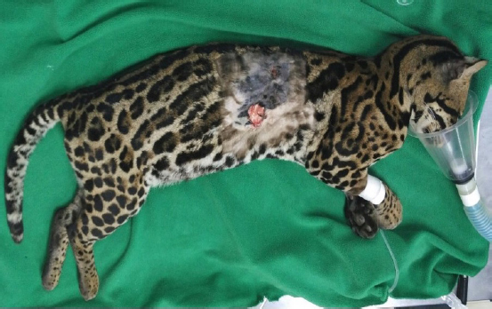 Fig. 1. Ocelot after clipping and skin disinfection upon admission. Two open, fresh lacerations are evident at the thoracic level, one dorsal and the other on the right flank of the patient.
