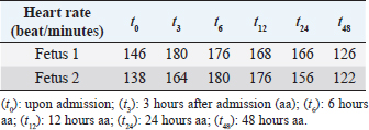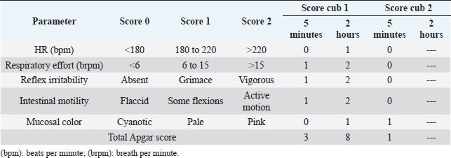 Table 3. Scores obtained in both cubs 5 minutes and 2 hours after delivery using the Apgar score system (Veronesi et al., 2009).