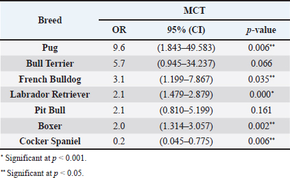Table 2. ORs and 95% CIs for MCT in various dog breeds. 2-sided Fisher exact test.