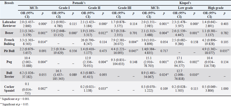 AbstractBackground: Skin tumors are the most frequently diagnosed lesions, of which 7%–21% are mast cell tumors (MCTs). There is a great effort to identify factors that can influence the prospective course of MCTs. Although, the histological grade is considering an important predictor helping to determine the malignancy and metastatic potential of MCTs. Aim: In this study, an epidemiological analysis of risk factors (breed, age, sex, and anatomical site) for dogs having MCTs was evaluated considering the respective MCTs histological grade in comparison to other skin tumors. Methods: The study included 244 dogs affected by cutaneous MCTs from a universe of 1,185 dogs diagnosed with skin tumors. A univariable analysis with Fisher exact test was performed to determine the odds ratios (ORs) with 95% confidence intervals (CIs). Results: Boxers had a higher predisposition to Patnaik’s grade I (OR=5.9, 95% CI 2.648–13.152) and to Kiupel’s low-grade MCTs (OR=2.6, 95% CI 1.539–4.447). Labrador retrievers (OR=2.1, 95% CI 1.423–3.184), and pugs (OR=12.9, 95% CI 2.336–70.931) had a predisposition for Patnaik’s grade II MCTs and Kiupel’s low-grade lesions (OR=2.3, 95% CI 1.478–3.597; OR=17.1, 95% CI 3.093–94.377, respectively). French bulldogs had a higher risk to grade III MCTs (OR=7.9, 95% CI 2.381–26.072). Pit bulls had a predisposition to grade III MCTs and Kiupel’s high-grade tumors (OR=4.4, 95% CI 1.221–16.1 and OR=4.962, 95% CI 1.362–18.077, respectively). Bull terriers (OR=12.7, 95% CI 2.098–76.818) presented higher risk for having low-grade MCTs. The perigenital area and trunk exhibit a greater risk for high grading lesion (OR=6.6, 95% CI 2.679–16.334; OR=1.9, 95% CI 1.028–3.395, respectively) and the limbs had a predisposition to grade II tumor (OR=1.6, 95% CI 1.134–2.395). A decreased risk of having MCT was seen in older dogs (from 7–10 years to 11–18 years) compared to that in the reference group (4–6 years). Conclusion: When comparing to canine skin tumors, this study showed a relationship between MCT histological grading and the risk factors, age, breed, and topography of canine MCTs. The variations noted in the clinical presentation of MCTs amongst predisposed dog breeds reinforces the relevance of the genetic background in MCTs carcinogenesis. Keywords: Dog, Kiupel, Mast cell tumor, Patnaik, Risk. IntroductionOne of the leading causes of mortality in dogs is cancer, accounting from 14% to 27% of all deaths in previous studies (Adams et al., 2010; Dobson, 2013). The quantity of diagnosed tumors is continuously rising since improved health care for pets currently broadens their life expectancy, allowing for the diagnosis of late-in-life diseases, such as cancer (Adams et al., 2010; Villamil et al., 2011; Dobson, 2013; Grüntzig et al., 2015; Śmiech et al., 2017, 2019). One of the most frequently diagnosed tumors are skin tumors, and approximately 7%–21% are mast cell tumors (MCTs) (Welle et al., 2008; Grüntzig et al., 2015). MCTs can be presented as isolated, small, and single case or have a multicentric growth (Blackwood et al., 2012). Plus they can infiltrate the neighboring tissues and metastasize to lymphatic system and internal organs, displaying a wide-ranging clinical course of action (Misdorp, 2004; Murphy et al., 2004; Welle et al., 2008; Blackwood et al., 2012; Śmiech et al., 2018). There is a great effort to identify factors that can influence the prospective course of this disease (Warland and Dobson, 2013; Śmiech et al., 2017, 2018, 2019). One of the most important tumor predictors that can determine its morphological characteristics, metastatic potential, response to treatment as well as prognosis is the histological grade (Zemke et al., 2002; Murphy et al., 2004; Wu et al., 2006; Dobson and Scase, 2007; Romansik et al., 2007; Fröberg et al., 2009; Brønden et al., 2010; Berlato et al., 2012; Costa Poggiani et al., 2012). Prior to 2011, the most commonly used MCTs histological grading system was the three-grade Patnaik system which recognizes three different categories: grade I, II, and III (Patnaik et al., 1984; Śmiech et al., 2017). Grade I are well-differentiated tumors and mostly develop in the dermis and less often in subcutaneous tissue (Śmiech et al., 2017; Tamlin et al., 2020). These tumors do not invade nearby tissues, hardly ever metastasize and generally, after surgical removal with clean margins, they do not recur (Tamlin et al., 2020). They have a predictably good long-term prognosis and a 12-month survival probability up to 100% (Tamlin et al., 2020). Grade II, or intermediate grade tumors, present higher tendency to invade neighboring, extend into the deeper layers of the skin and disseminate to other parts of the body, in comparison to grade I (Tamlin et al., 2020). When these tumors are incompletely surgical removed or with narrow margins, they have more chances to recur. About 87%–92% of these tumors have a 12-month survival probability (Tamlin et al., 2020). Grade III or high grade tumors are poorly differentiated, invade deep into the skin and underlying tissue and are extremely aggressive, presenting a metastasis rate of 55%–95% (Tamlin et al., 2020). Require aggressive therapeutic management since patients detain a poor long-term prognosis and about 16%–46% probability of 12-month survival (Tamlin et al., 2020). Animal outcome with grade II MCTs can be difficult to predict (Sabattini et al., 2015). In some cases, these lesions can behave either as grade I tumors, or more aggressively, as grade III (Garrett, 2014; Sabattini et al., 2015). An additional challenge is the trustworthiness of the grade evaluated and attributed by the pathologist since there is some degree of subjectivity within this system (Sabattini et al., 2015) . As a result of these challenges related with behavior variability and unpredictable clinical course, Kiupel et al. (2011) proposed a new 2-grade classification system di