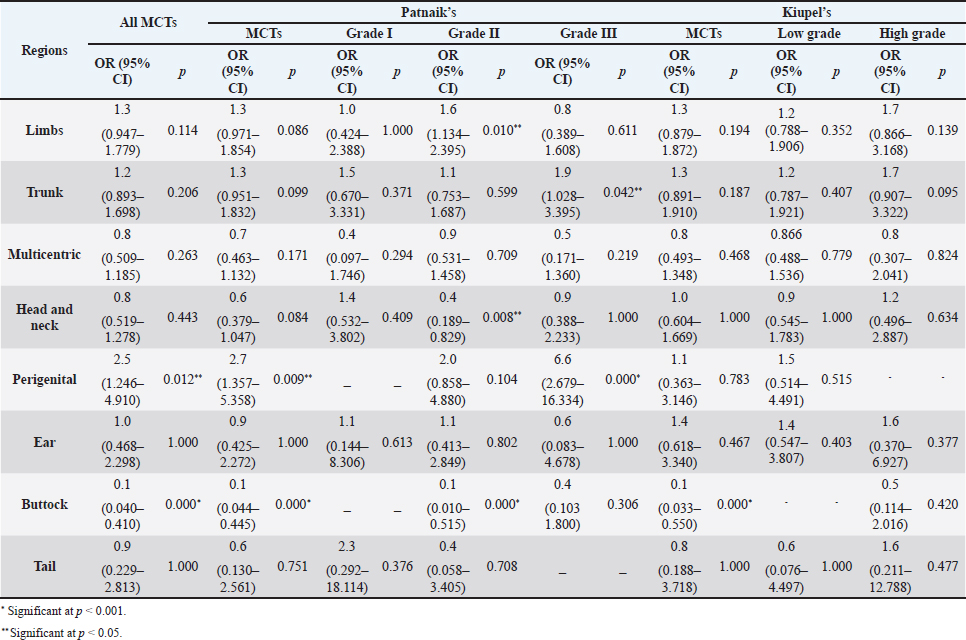 Table 5. ORs and 95% CIs for MCT in various anatomical locations, in all general MCTs and according to Patnaik’s and Kiupel’ classification systems. (p) p-value. 2-sided fisher exact test.