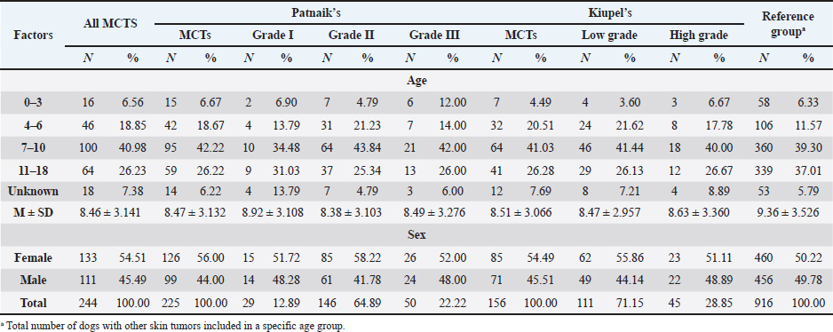 Table 6. Frequency of MCT in general and according to Patnaik and Kiupel’s classification by age and sex. (M) Mean and (SD) Standard deviation.